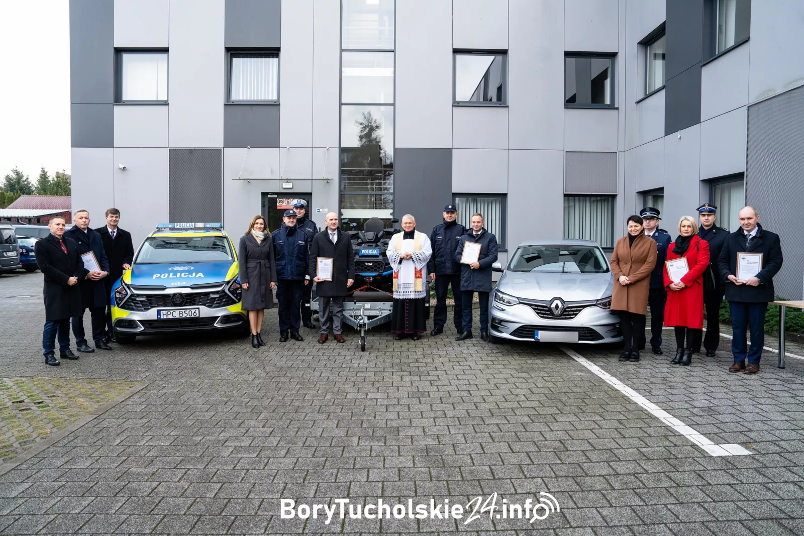 Na uroczystości na parking Komendy Powiatowej Policji w Tucholi przybyli samorządowcy z powiatu oraz przedstawiciele firm, które wsparły zakup auta. Jak mówił komendant powiatowy Paweł Zawada, radiowozy zostały zakupione w montażu finansowym 50 procent na 50 procent. Połowa to pieniądze policji, połowa to dofinansowania od instytucji i firm.