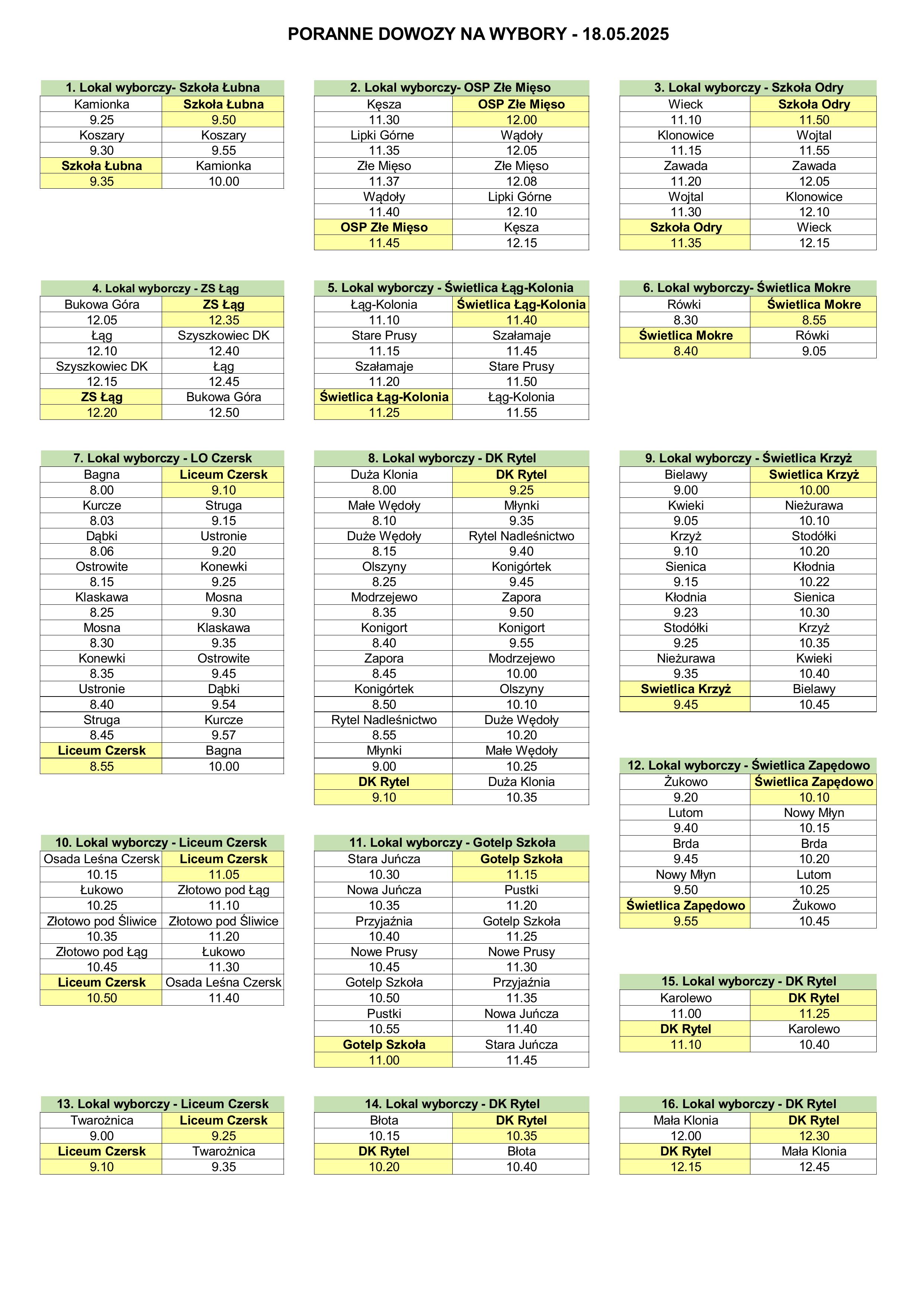 W związku z wyborami Prezydenta Rzeczypospolitej Polskiej, które odbędą się 18 maja 2025 roku, gmina Czersk organizuje transport dla osób ujętych w spisie wyborców.