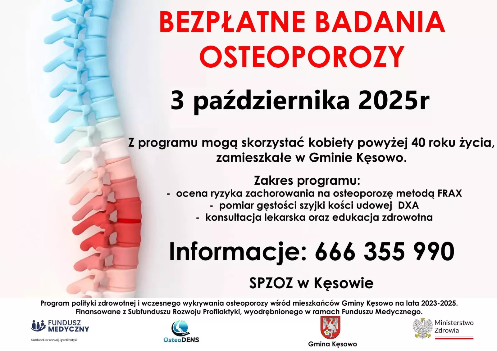 Już 3 października w SP ZOZ w Kęsowie odbędzie się ostatnie spotkanie w ramach programu profilaktyki osteoporozy. To szansa na skorzystanie z bezpłatnych badań i konsultacji dla osób z grupy ryzyka.