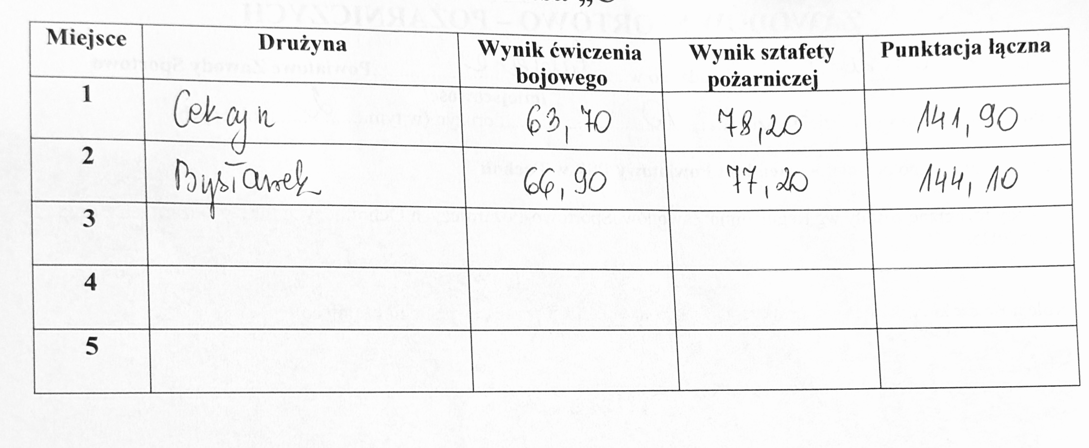 W rywalizacji żeńskiej najlepsze okazały się druhny z OSP w Cekcynie, które minimalnie wyprzedziły reprezentację OSP z Bysławka. Drużyna z Bysławka otrzymała także puchar za najlepszą musztrę.