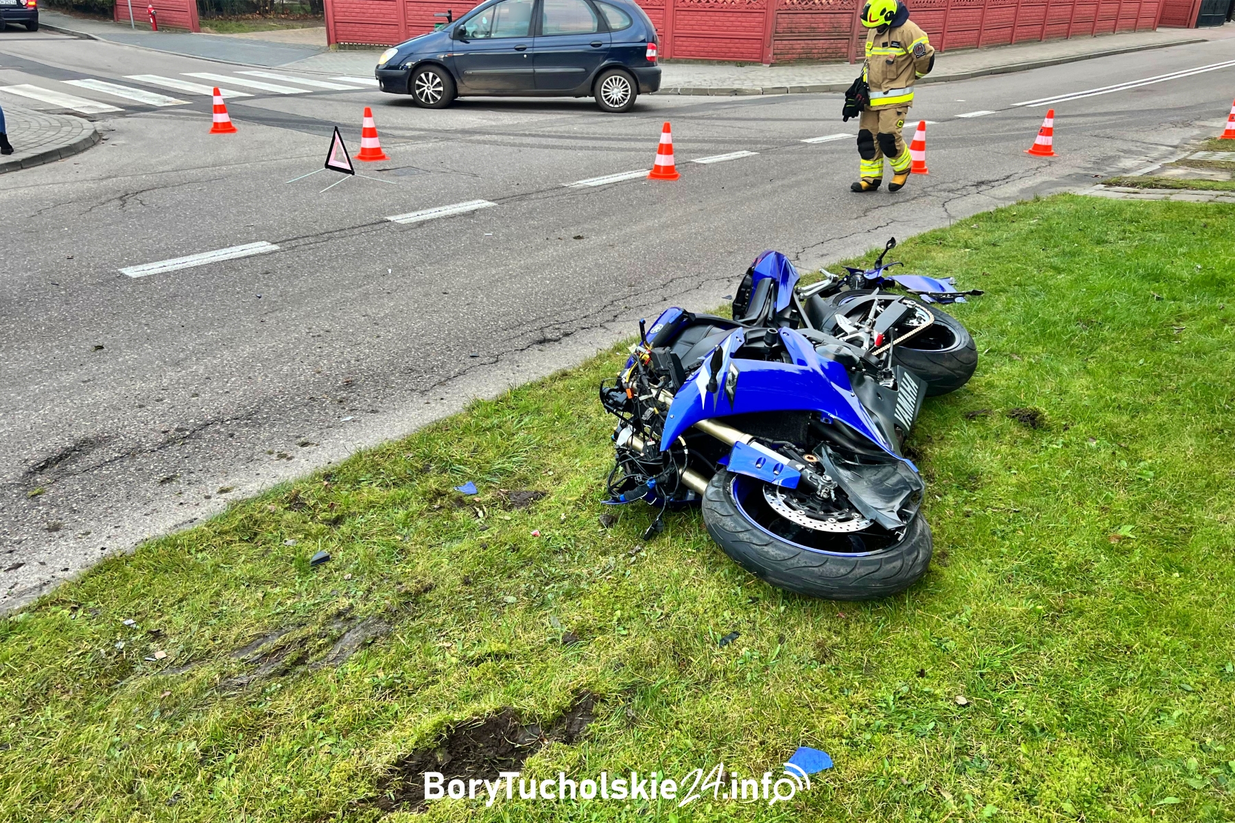 W piątkowe popołudnie (21.11) na ulicy Długiej w Łęgu doszło do groźnie wyglądającego zderzenia samochodu osobowego z motocyklem. Mimo ryzykownej jazdy motocyklisty – bez kasku i na jednym kole – nikt nie odniósł obrażeń. Na miejscu pracują służby. 40-latek nie miał prawa jazdy na motor, a maszyna tablic rejestracyjnych.
