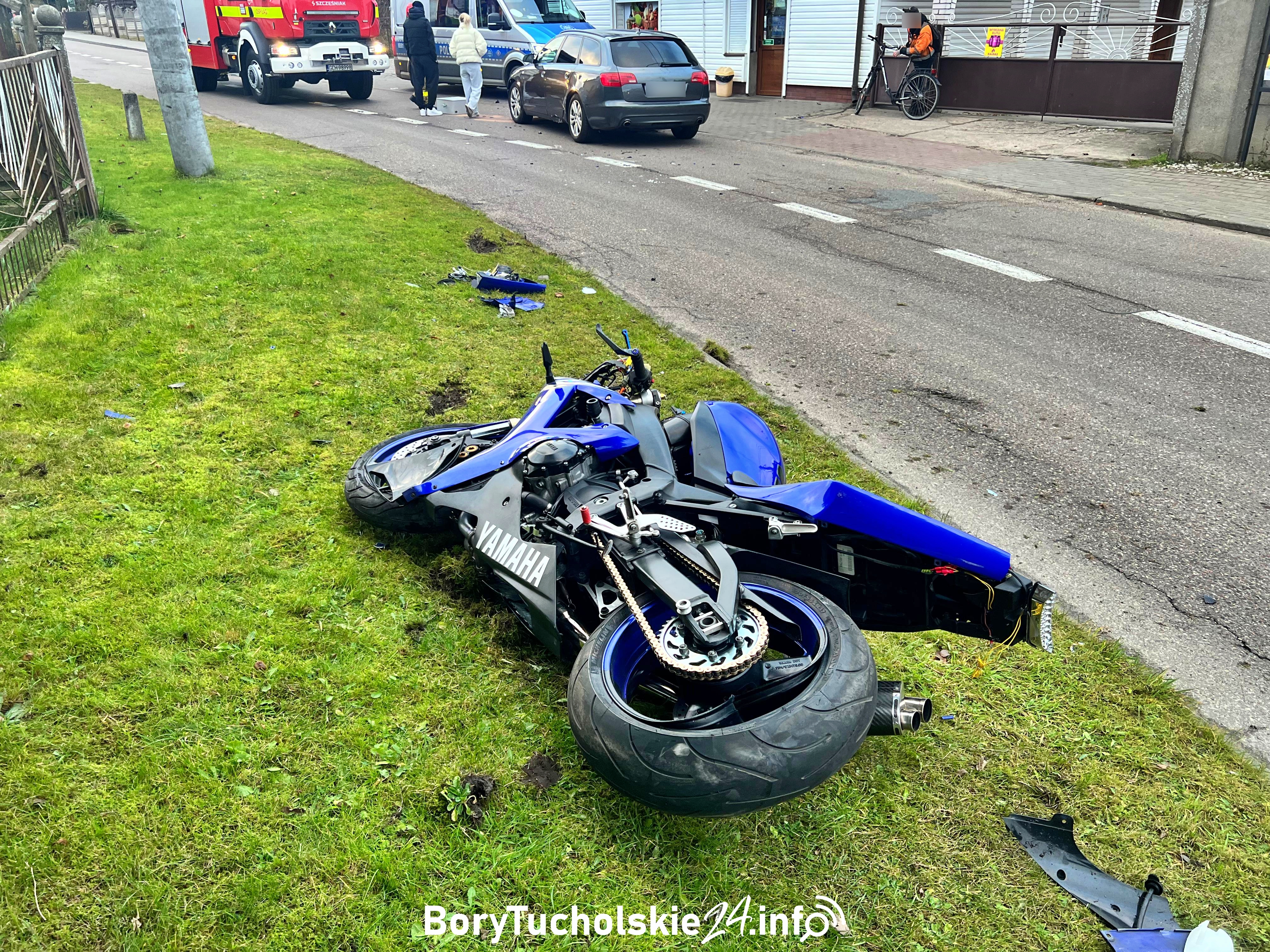Ze wstępnych ustaleń wynika, że 40-letni kierowca motocykla yamaha, jadąc bez kasku, nie dostosował prędkości, stracił panowanie nad pojazdem i zderzył się z jadącym z naprzeciwka audi.