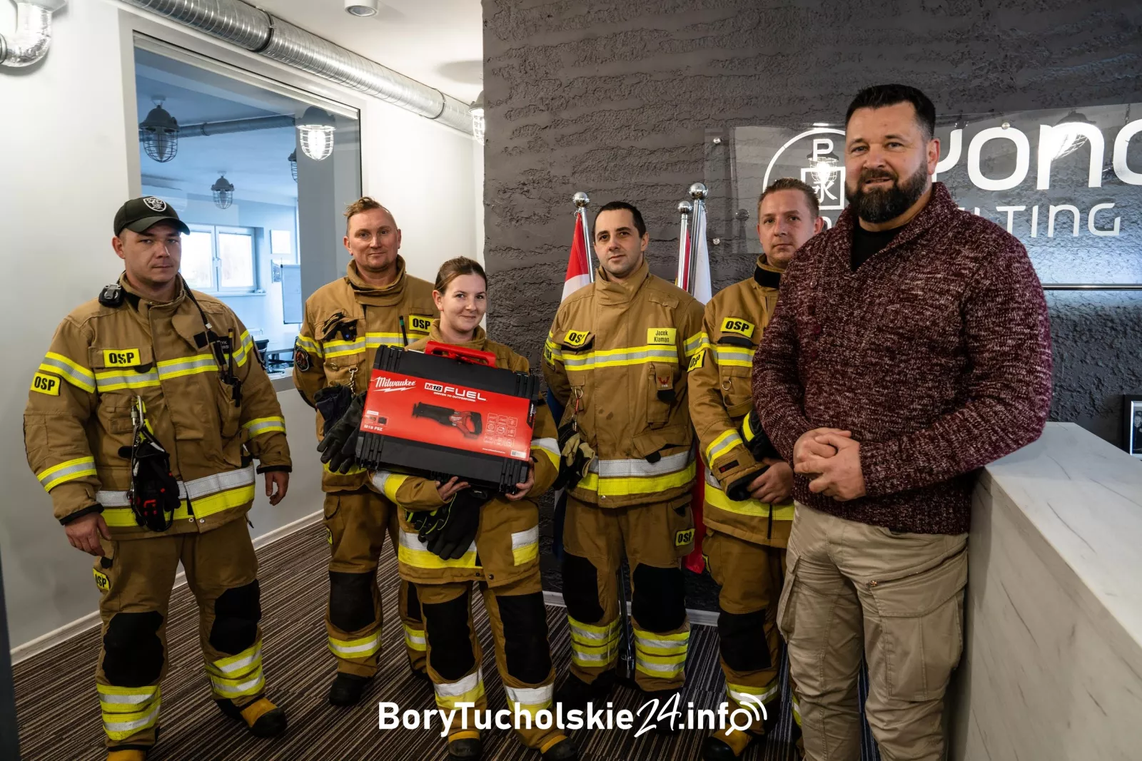 Jednostka z Łęga, gdzie mieszka Tomasz Mundry, otrzymała od niego akumulatorową piłę szablastą – To urządzenie, które ma wszechstronne zastosowanie. Możemy nią wyciąć szybę w aucie podczas wypadku czy przeciąć deski przy naprawie uszkodzonego dachu. Takiego sprzętu brakowało w naszej jednostce – mówił Jacek Klaman z OSP w Łęgu. – Przekazuję wam ten sprzęt i jednocześnie życzę, żeby nie trzeba było go często używać – mówił Tomasz Mundry.