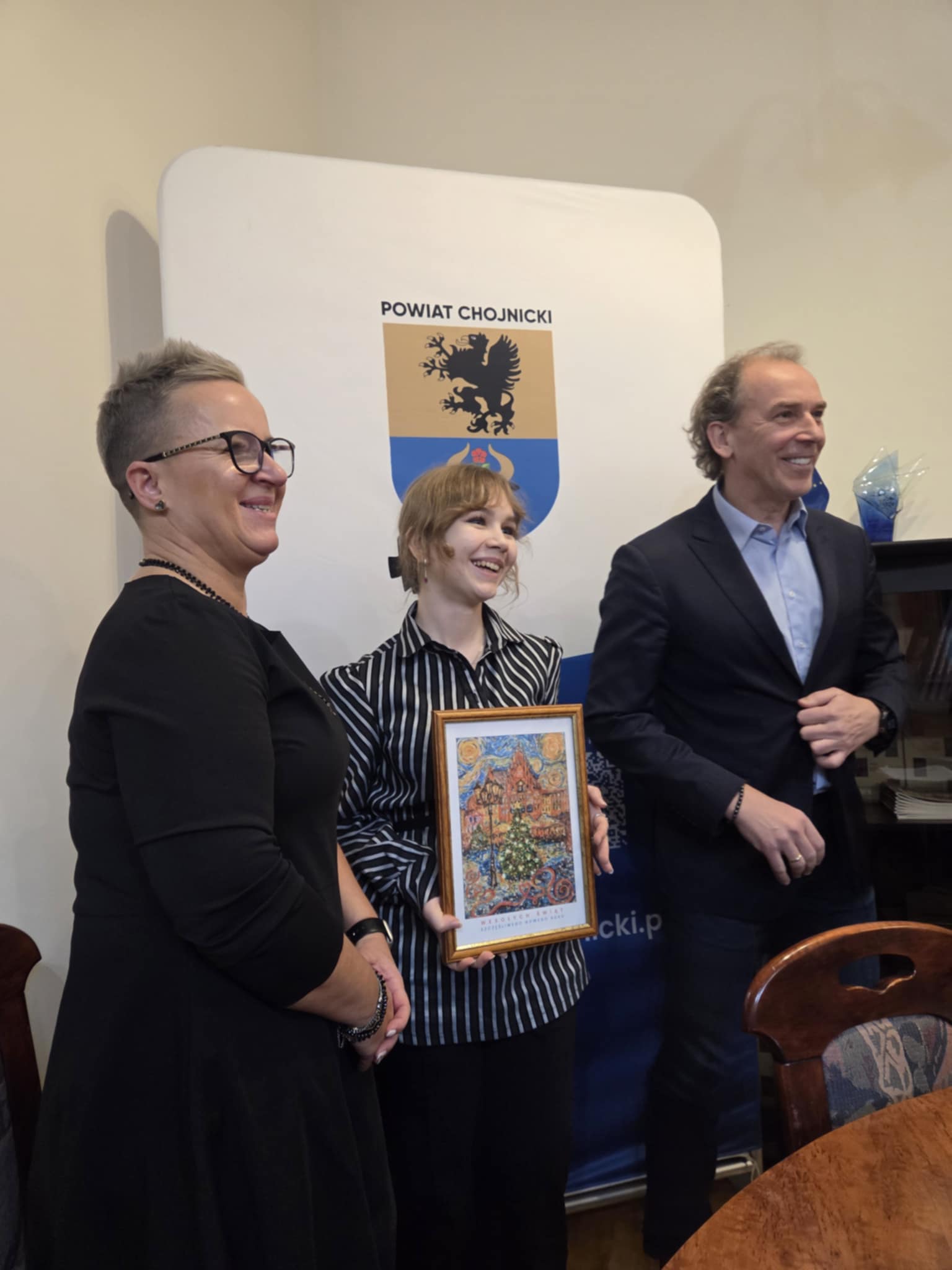 Jolanta Czechowska, uczennica Technikum nr 3 w Chojnicach, została laureatką drugiej edycji konkursu plastycznego „Święta Bożego Narodzenia w Powiecie Chojnickim”. Konkurs był skierowany do uczniów szkół ponadpodstawowych uczących się na terenie powiatu. W tym roku wpłynęło 20 prac, spośród których komisja konkursowa wybrała jedną zwycięską. Nagrodę w wysokości 700 zł wręczył laureatce starosta chojnicki Marek Szczepański. Zwycięska praca posłuży jako oficjalna kartka bożonarodzeniowa Powiatu Chojnickiego i już niebawem zostanie rozesłana do mieszkańców. - Inspirowałam się pracami Vincentego van Gogha - mówiła uczennica, mieszkanka Czerska. - Samo stworzenie pracy zajęło mi osiem godzin - dodała. Poza malarstwem Jola interesuje się również projektowaniem ubrań i niewykluczone, że właśnie z tą dziedziną zwiąże swoją przyszłość.