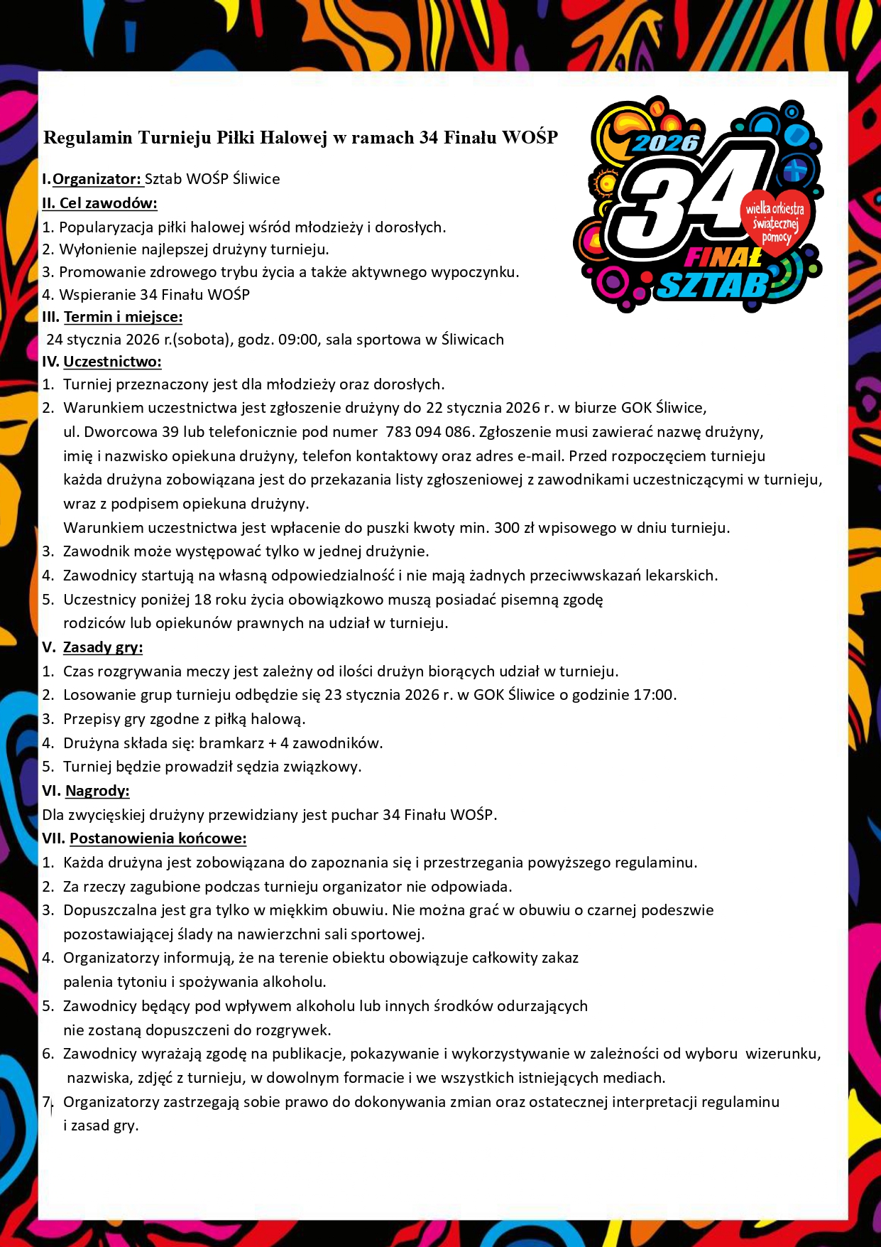 Losowanie grup turniejowych zaplanowano na 23 stycznia o godzinie 17:00 w siedzibie Gminnego Ośrodka Kultury w Śliwicach. Dla zwycięskiej drużyny przewidziany został puchar 34. Finału Wielkiej Orkiestry Świątecznej Pomocy.