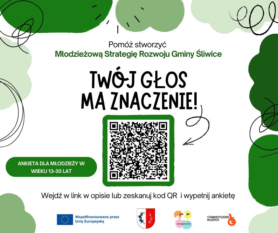 Gmina Śliwice zachęca młodzież w wieku od 13 do 30 lat do udziału w krótkiej ankiecie konsultacyjnej. Jej celem jest zebranie opinii, potrzeb i pomysłów młodych mieszkańców, które zostaną wykorzystane przy tworzeniu Młodzieżowej Strategii Rozwoju Gminy Śliwice. Ankieta dotyczy m.in. tego, czego młodym osobom brakuje w gminie, jakie zmiany są ich zdaniem potrzebne oraz jak wyobrażają sobie rozwój Śliwic w najbliższych latach. Wypełnienie formularza zajmuje około pięciu minut, a zebrane odpowiedzi mają realny wpływ na planowane działania samorządu skierowane do młodzieży.