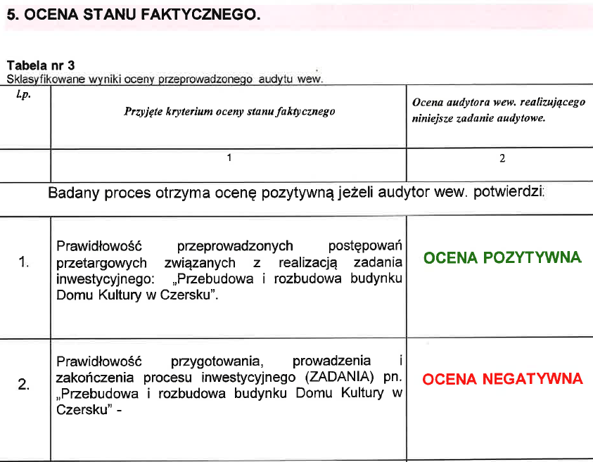 Mimo że audyt związany z realizacją modernizacji Domu Kultury w Czersku powstał 5 grudnia 2025 r., radni otrzymali go dopiero 15 stycznia tego roku. Audytor Tomasz Zaremba zarzuca w nim poprzednim władzom gminy rzekome błędy związane z realizacją inwestycji i jej rozliczaniem. Warto zauważyć, że kontroler od stycznia 2025 r. jest zatrudniony w czerskim Urzędzie Miejskim, a kilka lat temu pracował też na zlecenie gminy Zblewo, a nadzorującym jego pracę był Daniel Szpręga.