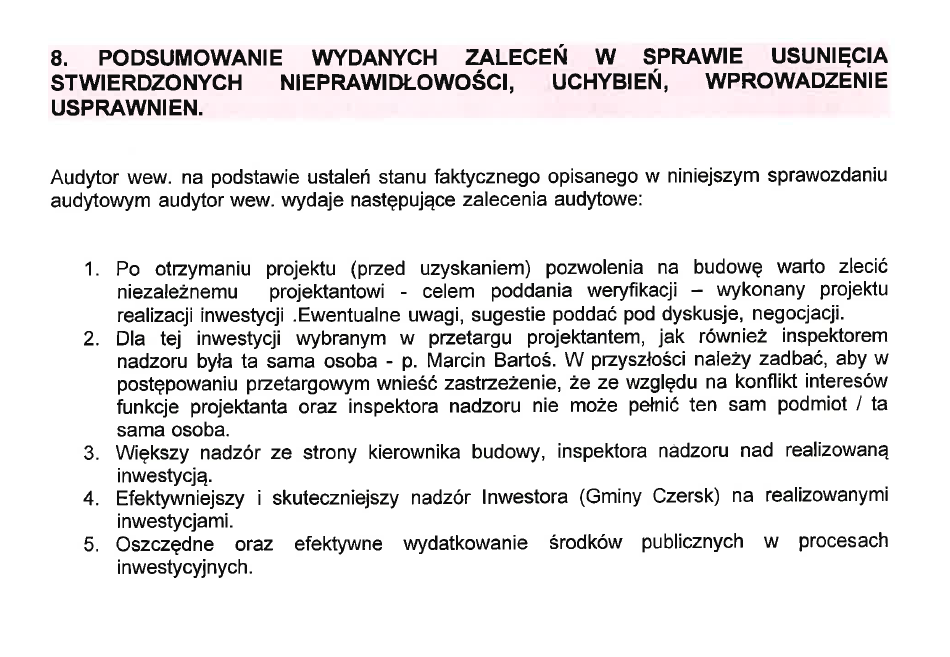 Audytor zarzuca też gminie Czersk naruszenie zasady oszczędnego oraz efektywnego gospodarowania środkami publicznymi. Pisze o kilku fakturach z różnych firm. Najpierw był projekt, a później kilka jego aktualizacji. Mimo że faktury wystawiały inne firmy, jako ich reprezentanci widnieją ci sami wykonawcy. W sumie kosztowało to niespełna 120 tys. zł, a ostatnia płatność miała miejsce dwa miesiące po otwarciu obiektu.