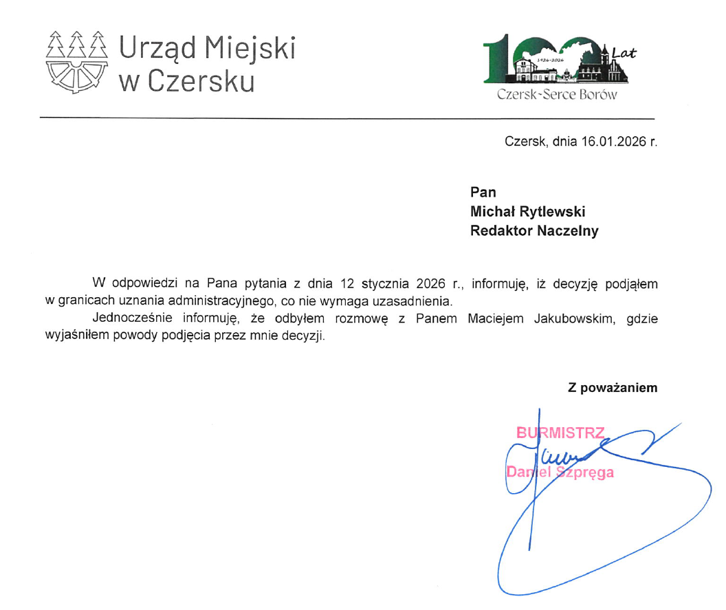 Zapytaliśmy więc Daniela Szpregę o przyczyny odwołania Macieja Jakubowskiego. – Decyzję podjąłem w granicach uznania administracyjnego, co nie wymaga uzasadnienia. Jednocześnie informuję, że odbyłem rozmowę z Panem Maciejem Jakubowskim, gdzie wyjaśniłem powody podjęcia przeze mnie decyzji – napisał burmistrz Czerska.