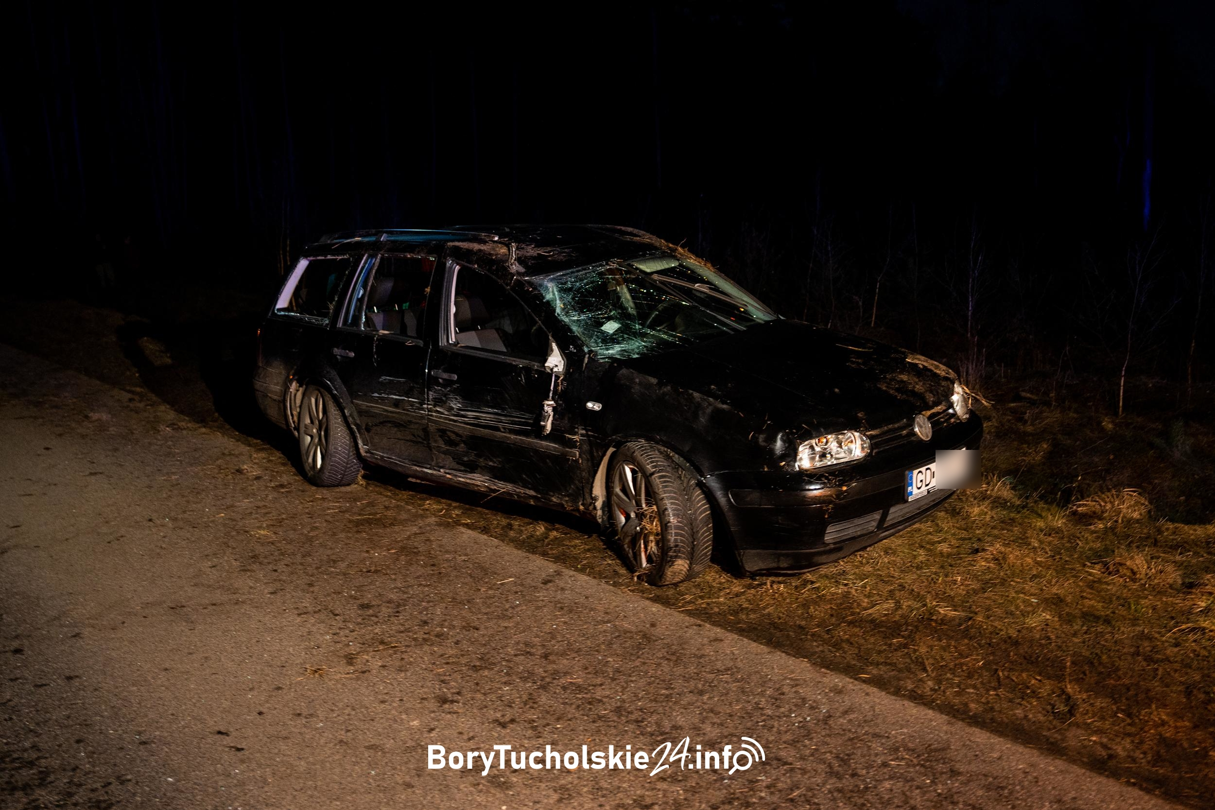 Jak dowiedzieliśmy się na miejscu, oba auta jechały od strony Śliwic w kierunku Czerska. Za zakrętem, tuż przed granicą gmin, biały Ford Fusion skręcał w lewo, w leśną drogę prowadzącą do miejscowości Mosna. Wtedy w jego bok uderzył wyprzedający go Volkswagen Golf. Świadkowie mówią, że kombi kilka razy koziołkowało. Na miejscu interweniował Zespół Ratownictwa Medycznego i policja. Kierowca Volkswagena trafił do szpitala. Jak udało nam się dowiedzieć, kierujący fordem nie miał prawa jazdy.