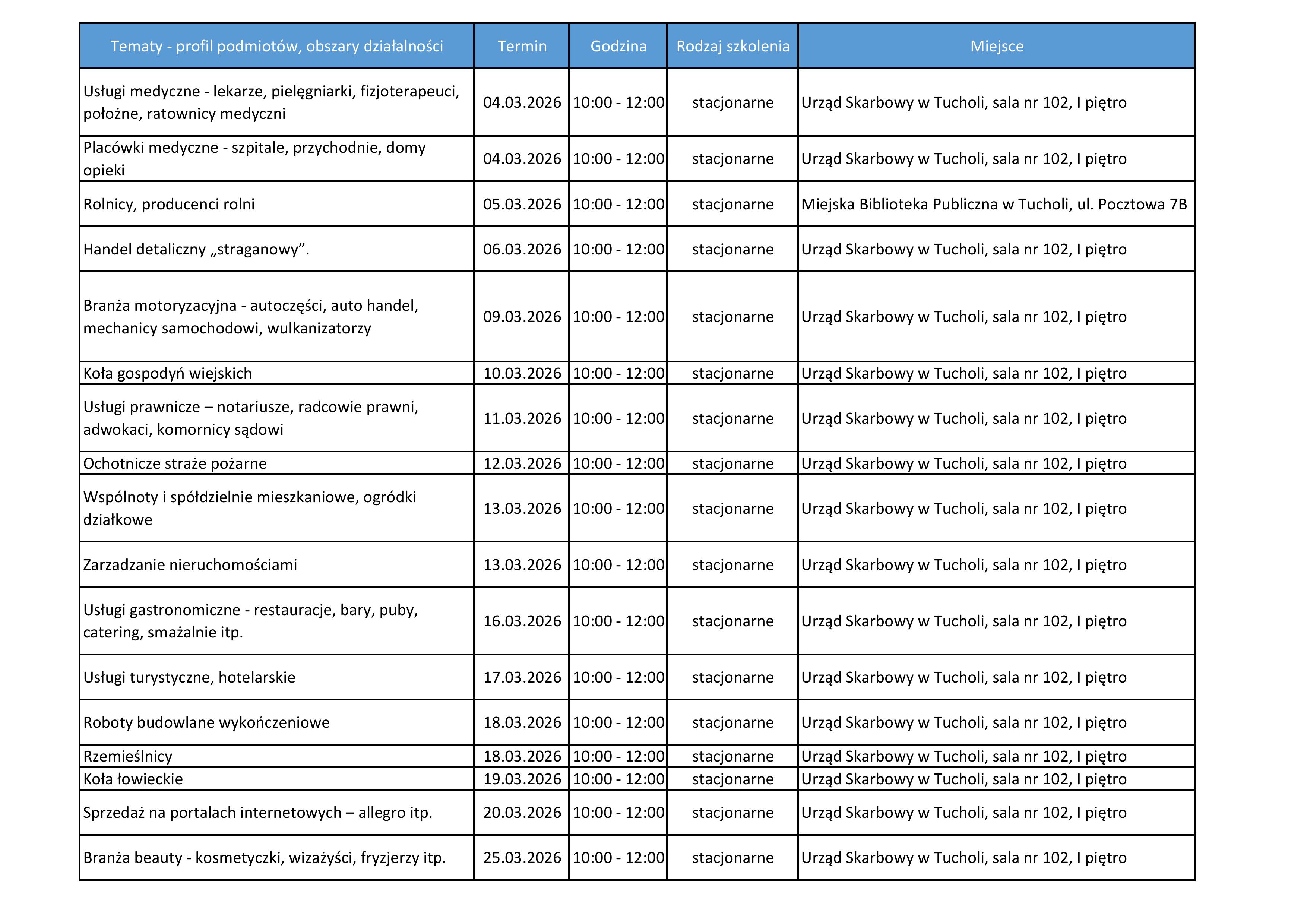 Szkolenia podzielone są tematycznie według profilu działalności uczestników. Część spotkań już się odbyła, natomiast w najbliższym czasie zaplanowano kolejne terminy skierowane do wybranych grup. Nadchodzące szkolenia przeznaczone są m.in. dla przedstawicieli Ochotniczych Straży Pożarnych, wspólnot i spółdzielni mieszkaniowych, ogródków działkowych oraz podmiotów zajmujących się zarządzaniem nieruchomościami. W kolejnych terminach zaplanowano także spotkania dla przedsiębiorców z branży gastronomicznej, turystycznej i hotelarskiej, wykonujących roboty budowlane i wykończeniowe, rzemieślników, kół łowieckich, sprzedawców działających na portalach internetowych oraz przedstawicieli branży beauty.