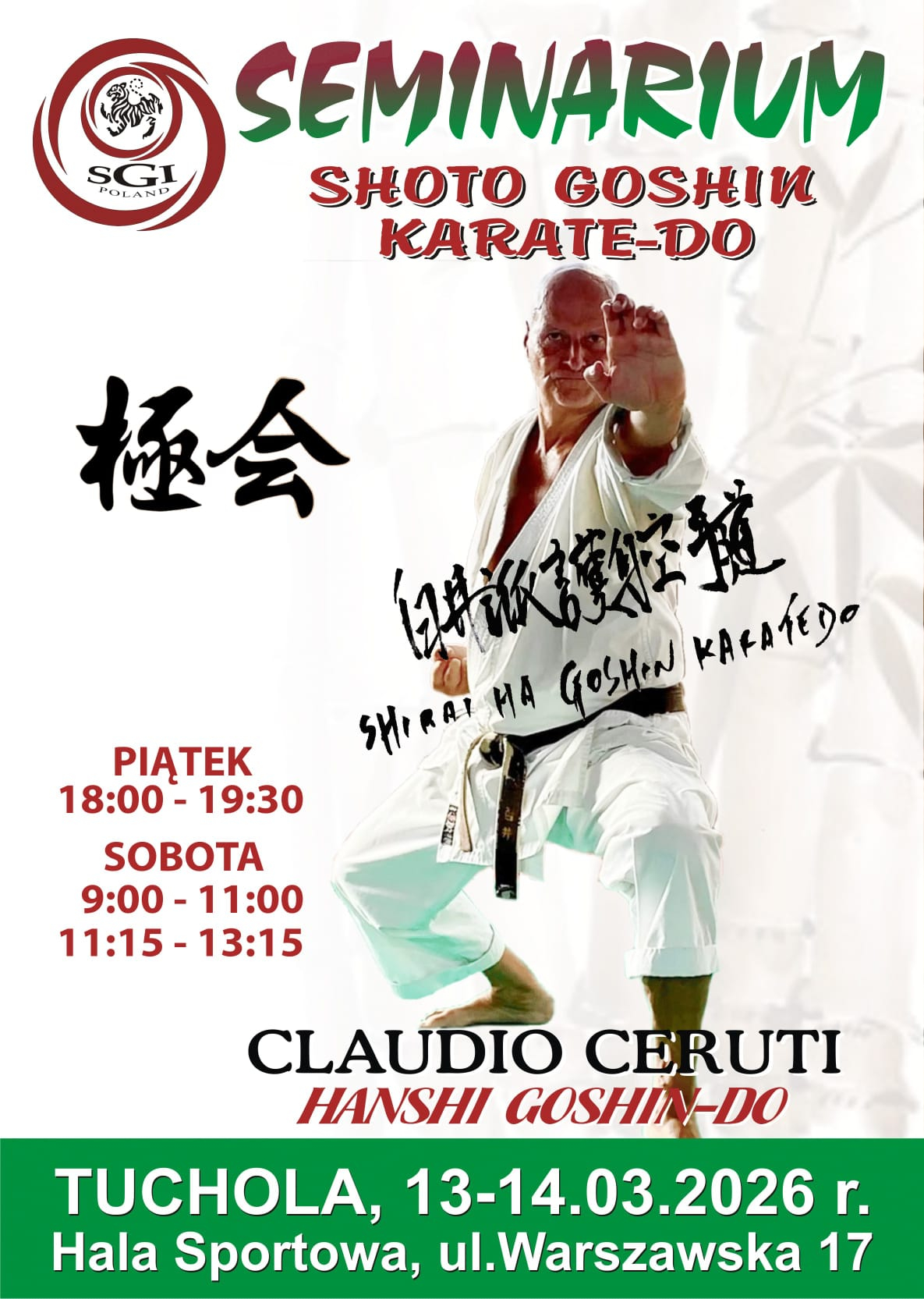 Już w ten weekend, na hali Ośrodka Sportu i Rekreacji w Tucholi, Sensei Claudio Ceruti poprowadzi Międzynarodowe Szkolenie Karate. To jednak nie wszystko. Dodatkowo, na prośbę organizatora Tomasza Krygowskiego, sensei Claudio już dziś poprowadzi trening klubowy w Czersku, a jutro w Tucholi. To duże wydarzenie dla klubu Shotokan, który prowadzi zajęcia w Tucholi, Czersku i Chojnicach.