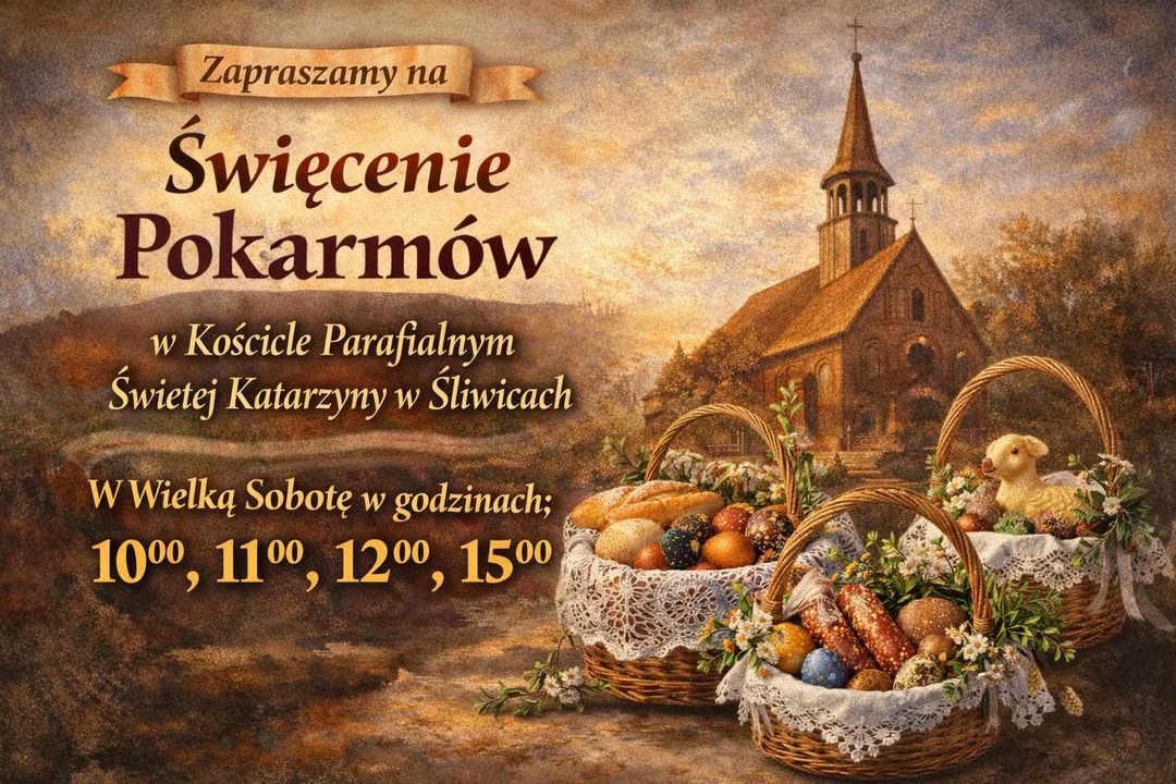 Dodatkowo w Wielką Sobotę odbędzie się święcenie pokarmów. W kościele parafialnym w Śliwicach będzie ono miało miejsce w godzinach 10, 11, 12 oraz 15. Parafia zaprasza wszystkich wiernych do wspólnego uczestnictwa w tych uroczystościach i przygotowania się do obchodów Zmartwychwstania Pańskiego.