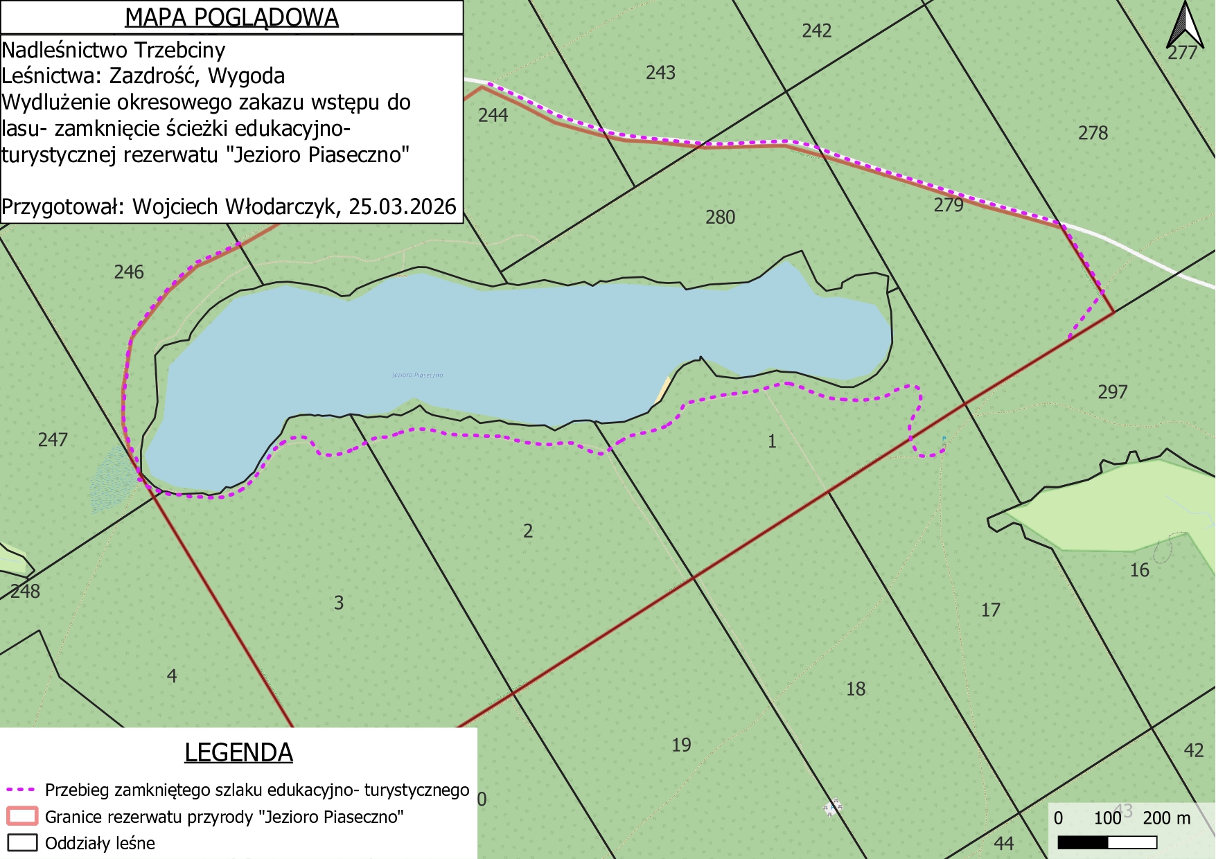Nadleśnictwo Trzebciny poinformowało o wydłużeniu obowiązywania zakazu wstępu na część rezerwatu przyrody „Jezioro Piaseczno”. Decyzja została podjęta po stwierdzeniu występowania drzew stwarzających zagrożenie dla ludzi i mienia oraz na polecenie Regionalnej Dyrekcji Ochrony Środowiska. Zamknięty szlak edukacyjno-turystyczny będzie niedostępny do 30 września 2026 r. Na terenie objętym zakazem ustawione jest odpowiednie oznakowanie, a dla ułatwienia orientacji przygotowano mapę sytuacyjną przebiegu trasy. Osoby zainteresowane szczegółami mogą kontaktować się z pracownikiem do spraw ochrony przyrody w Nadleśnictwie Trzebciny.