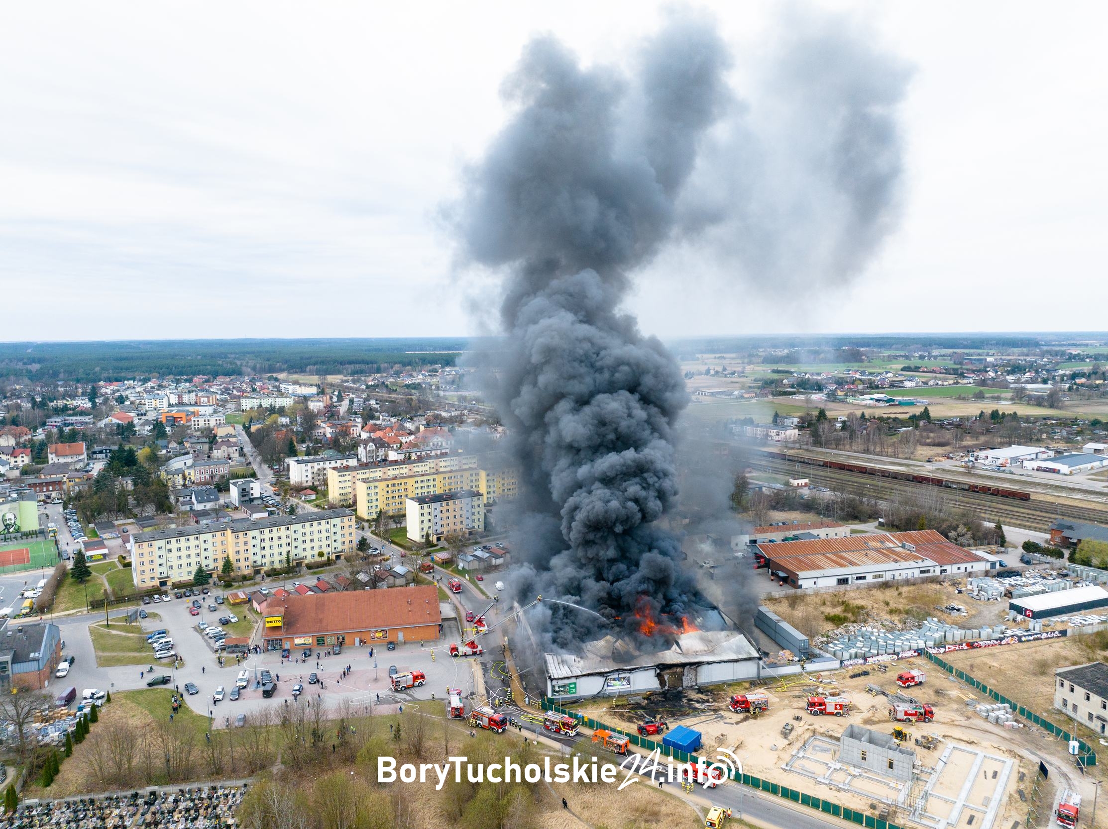 Na miejscu pożaru pracowało i nadal pracuje 26 jednostek straży pożarnej z powiatów chojnickiego, kościerskiego, bytowskiego i starogardzkiego. W działaniach biorą udział także jednostki z Gdańska (Komenda Wojewódzka) oraz z Gdyni. Na tę chwilę nie ma informacji o osobach poszkodowanych. W trakcie akcji strażacy podjęli decyzję o ewakuacji okolicznego bloku mieszkalnego oraz marketu spożywczego.