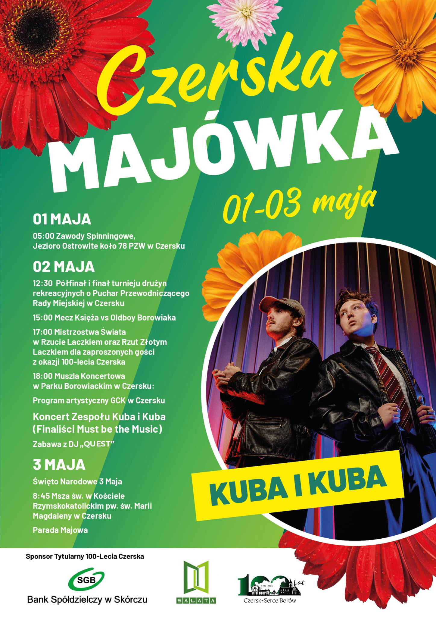 Obchody rozpoczną się w piątek, 1 maja, bardzo wcześnie rano. Już o godzinie 5:00 nad jeziorem Ostrowite wystartują zawody spinningowe, organizowane przez Koło nr 78 PZW w Czersku. Drugi dzień majówki, 2 maja, upłynie pod znakiem rywalizacji i dobrej zabawy. W godzinach popołudniowych rozegrane zostaną półfinały i finał turnieju drużyn rekreacyjnych o Puchar Przewodniczącego Rady Miejskiej w Czersku. Następnie na boisku odbędzie się mecz Księża VS Oldboy Borowiaka. Uczestnicy będą mogli również spróbować swoich sił w Mistrzostwach Świata w rzucie laczkiem, a zaproszeni goście wezmą udział w rzucie złotym laczkiem, organizowanym z okazji jubileuszu 100-lecia Czerska. Wieczorem wydarzenia przeniosą się do Parku Borowiackiego, gdzie na muszli koncertowej odbędzie się program artystyczny przygotowany przez Gminne Centrum Kultury w Czersku. Na scenie wystąpi duet Kuba i Kuba - finaliści programu „Must Be The Music”. Po koncercie zaplanowano zabawę taneczną z DJ Quest, która potrwa do późnych godzin wieczornych. Ostatni dzień obchodów, 3 maja, będzie miał charakter patriotyczny. O godzinie 8:45 w kościele pw. św. Marii Magdaleny w Czersku odprawiona zostanie msza święta w intencji Ojczyzny. Następnie ulicami miasta przejdzie tradycyjna parada majowa.