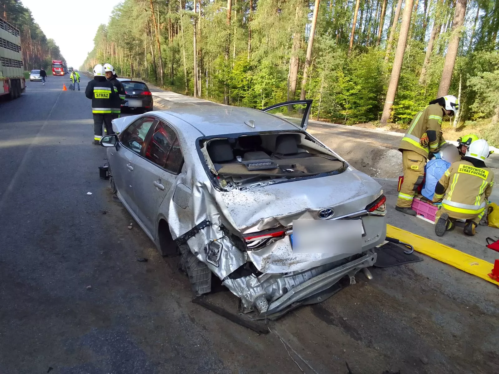Ze wstępnych ustaleń wynika, że kierowca srebrnej toyoty wyprzedzał kolumnę wolniej jadących aut. W tym samym czasie prowadzący jeden z wyprzedzanych samochodów także postanowił rozpocząć manewr i zjechał na lewy pas. Kierujący toyotą, żeby uniknąć zderzenia, zjechał na pobocze. Auto wpadło do rowu i później wróciło na jezdnię. Zniszczenia w samochodzie są poważne. Kierowcy nic poważnego się nie stało, ale pasażerka trafiła do szpitala.