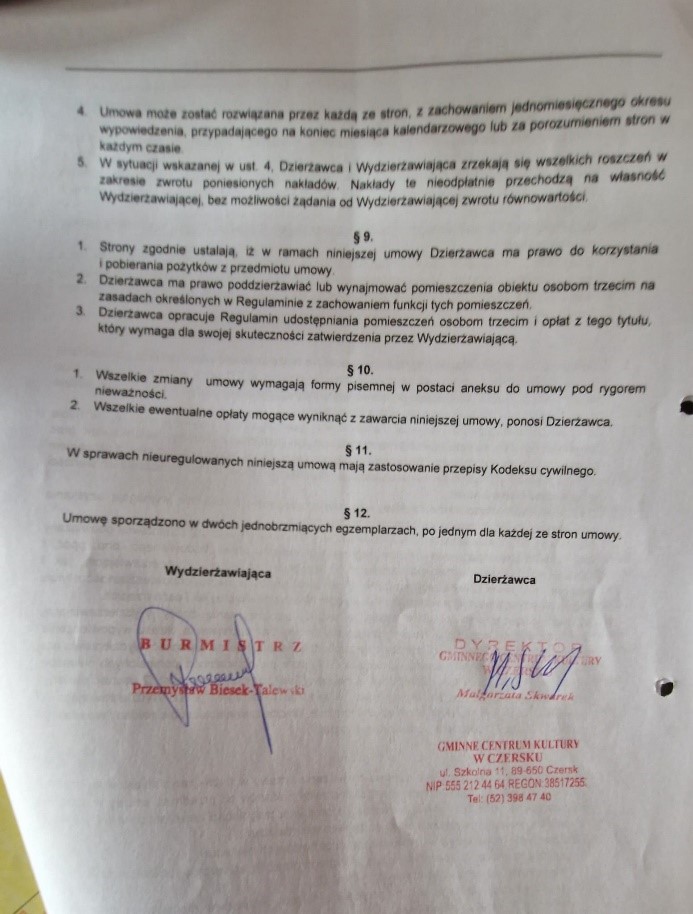 Już podczas kontroli Przemysław Biesek-Talewski mówił, że zgodnie z umową dzierżawy zawartą pomiędzy gminą Czersk i Gminnym Centrum Kultury, zmiana przeznaczenia pomieszczeń wymaga odrębnego aneksu. W GCK aneksu, ani nawet umowy nie było. Radni udali się więc do urzędu miejskiego. „Według oświadczenia pani Małgorzaty Janikowskiej – kierowniczki Wydziału Planowania i Gospodarki, nie ma pisemnej zgody Gminy na zmianę przeznaczenia Sali Widokowej z sali warsztatowej na pomieszczenie administracyjne (gabinet dyrektora)” – zauważają radni.