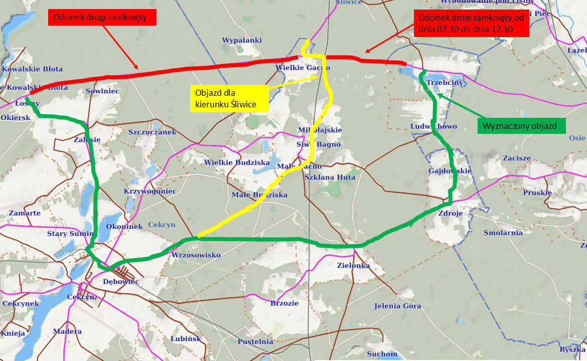 Chodzi o odcinki od skrzyżowania na Zalesie do Wielkiego Gacna i skrzyżowania na Śliwice oraz od krzyżówki z drogą w kierunku Mikołajskich w gminie Cekcyn do Trzebcin. Cały czas można poruszać się na powiatówce pomiędzy Wielkim Gacnem i przejazdem kolejowym. Umożliwia to ruch od Śliwic w kierunku Cekcyna.