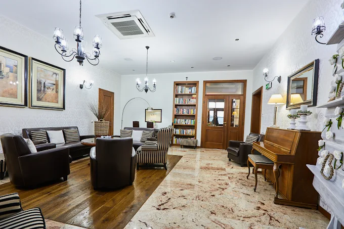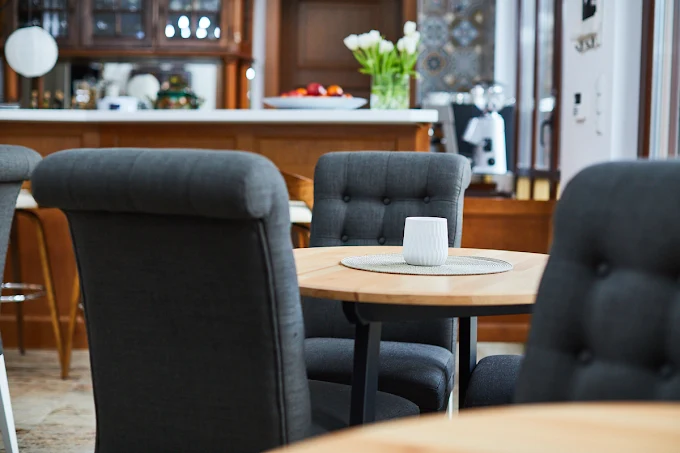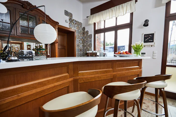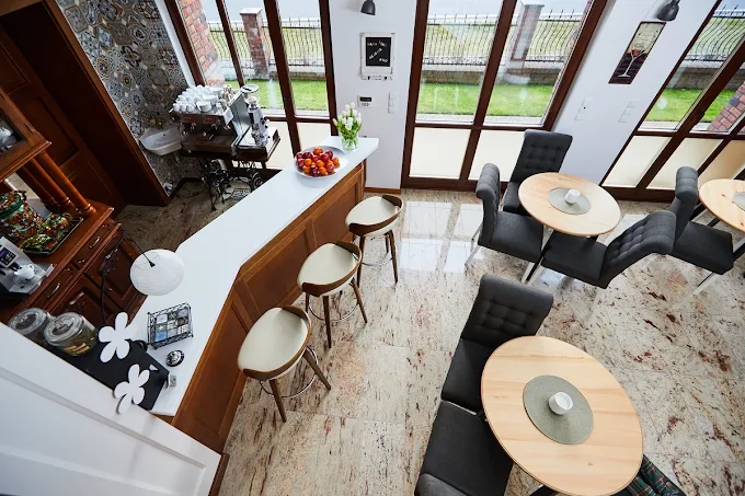 Na parterze znajduje się kawiarnia, w której serwowane są śniadania. Dla osób korzystających z zakwaterowania w domkach przygotowano aneks kuchenny umożliwiający samodzielne przygotowywanie posiłków. Ośrodek zaprojektowano z dbałością o szczegóły, z myślą o zapewnieniu komfortowego wypoczynku.