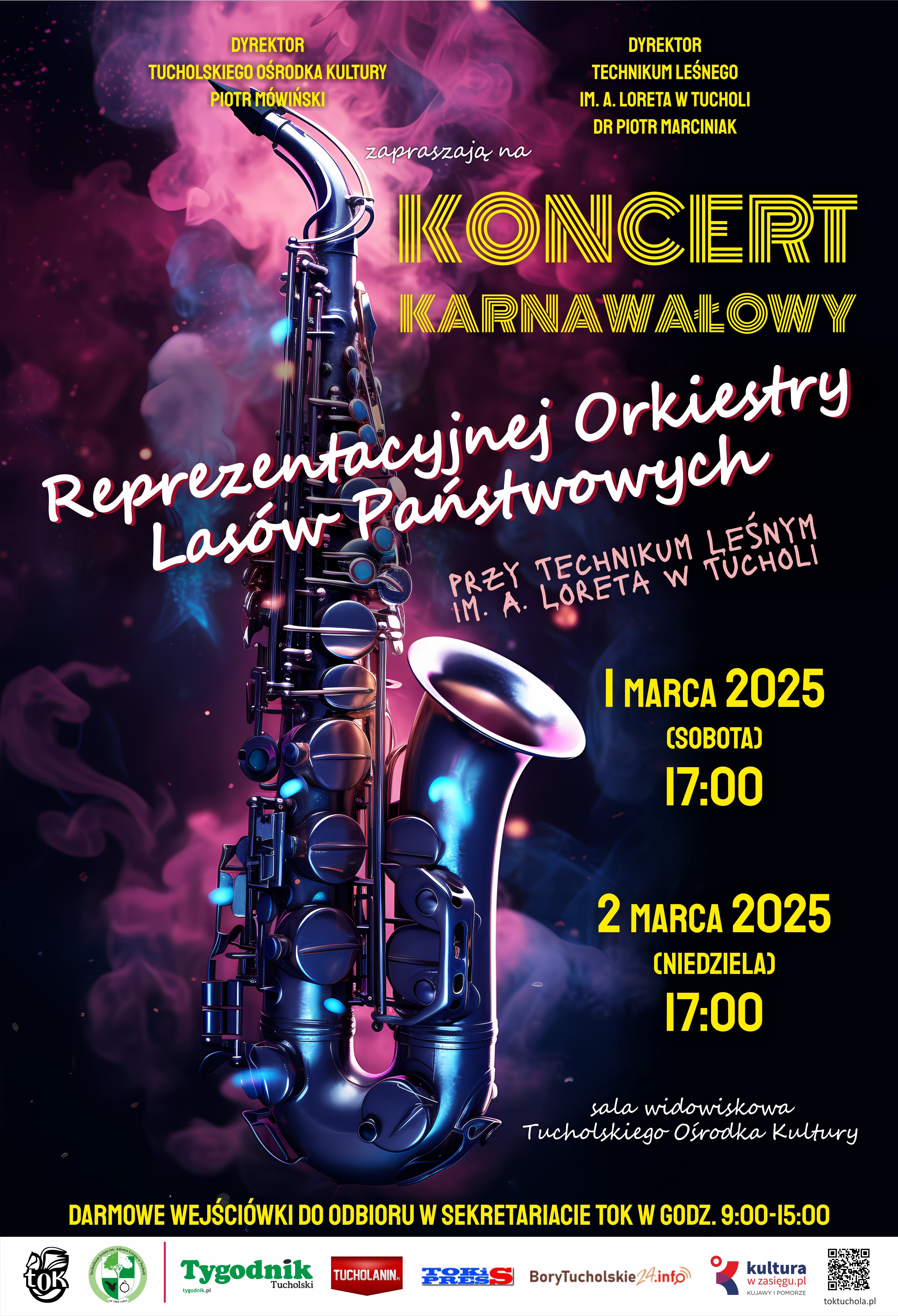 Dyrektor Tucholskiego Ośrodka Kultury, Piotr Mówiński i dyrektor Technikum Leśnego w Tucholi, dr Piotr Marciniak zapraszają na Koncert Karnawałowy Reprezentacyjnej Orkiestry Lasów Państwowych przy Technikum Leśnym im. A. Loreta w Tucholi pod dyrygenturą Damiana Kolassy. Wydarzenie odbędzie się w dwóch terminach: w sobotę 1 marca 2025 r. o godz. 17:00 i w niedzielę 2 marca 2025 r. o godz. 17:00 w sali widowiskowej Tucholskiego Ośrodka Kultury. Darmowe wejściówki do odbioru w sekretariacie TOK w godz. 09:00-15:00.