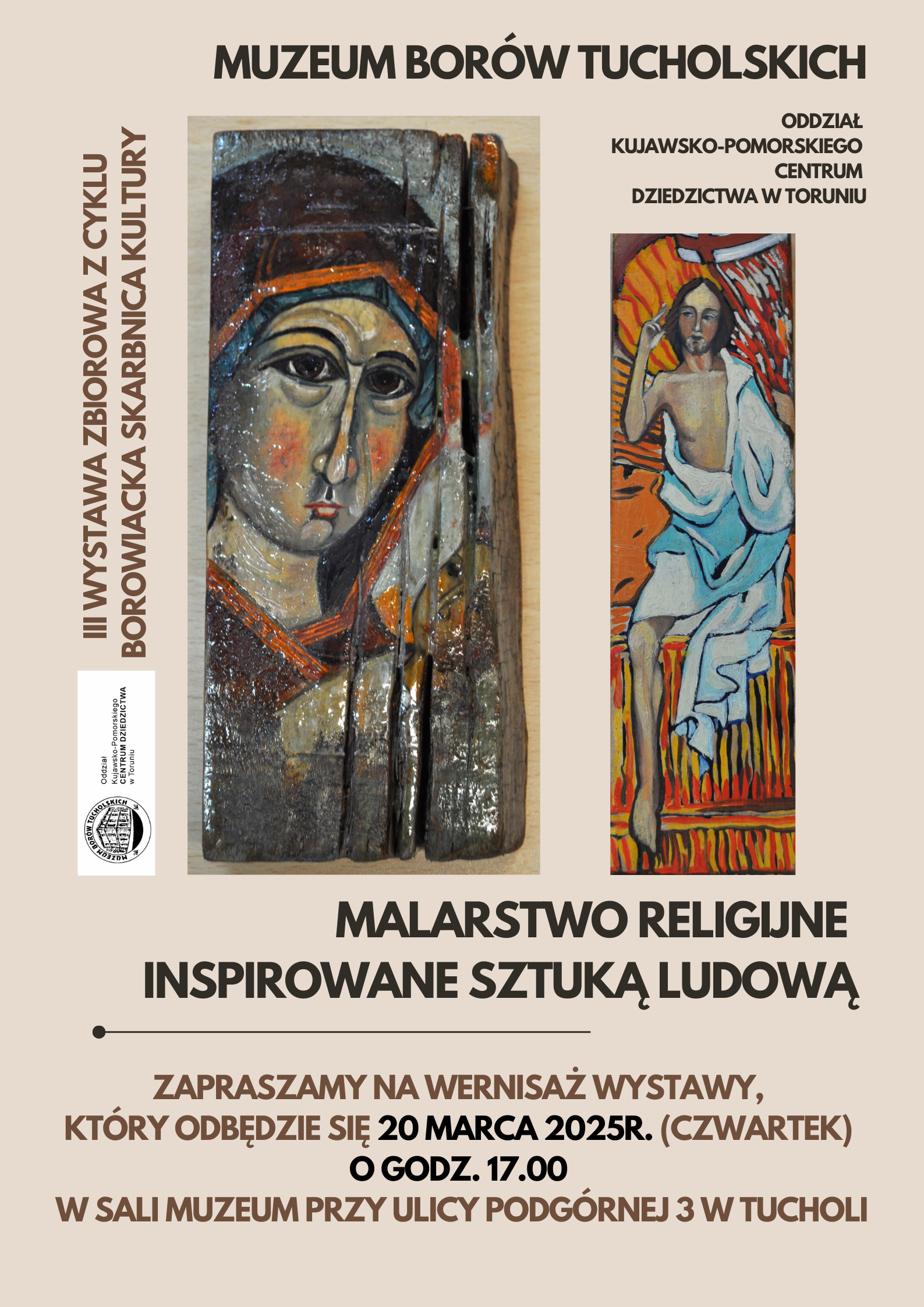 W Muzeum Borów Tucholskich odbędzie się otwarcie trzeciej wystawy zbiorowej z cyklu Borowiacka Skarbnica Kultury. Tegoroczna ekspozycja nosi tytuł „Malarstwo religijne inspirowane sztuką ludową” i zaprezentuje prace takich osób jak: Halina Deja, Magdalena Jutrowska, Helena Kaczanowska, Franciszka Kędzierska, Zygmunt Kędzierski, Katarzyna Kosińska-Wąśniewska, Anna Narloch, Jadwiga Nowacka, Małgorzata Obuchowska, Paweł Obuchowski, Lucyna Pawelska, Anna Przytarska, Justyna Wojciechowska, Marian Kuźmiński, Włodzimierz Ostoja-Lniski i Zbigniew Urbanowski.