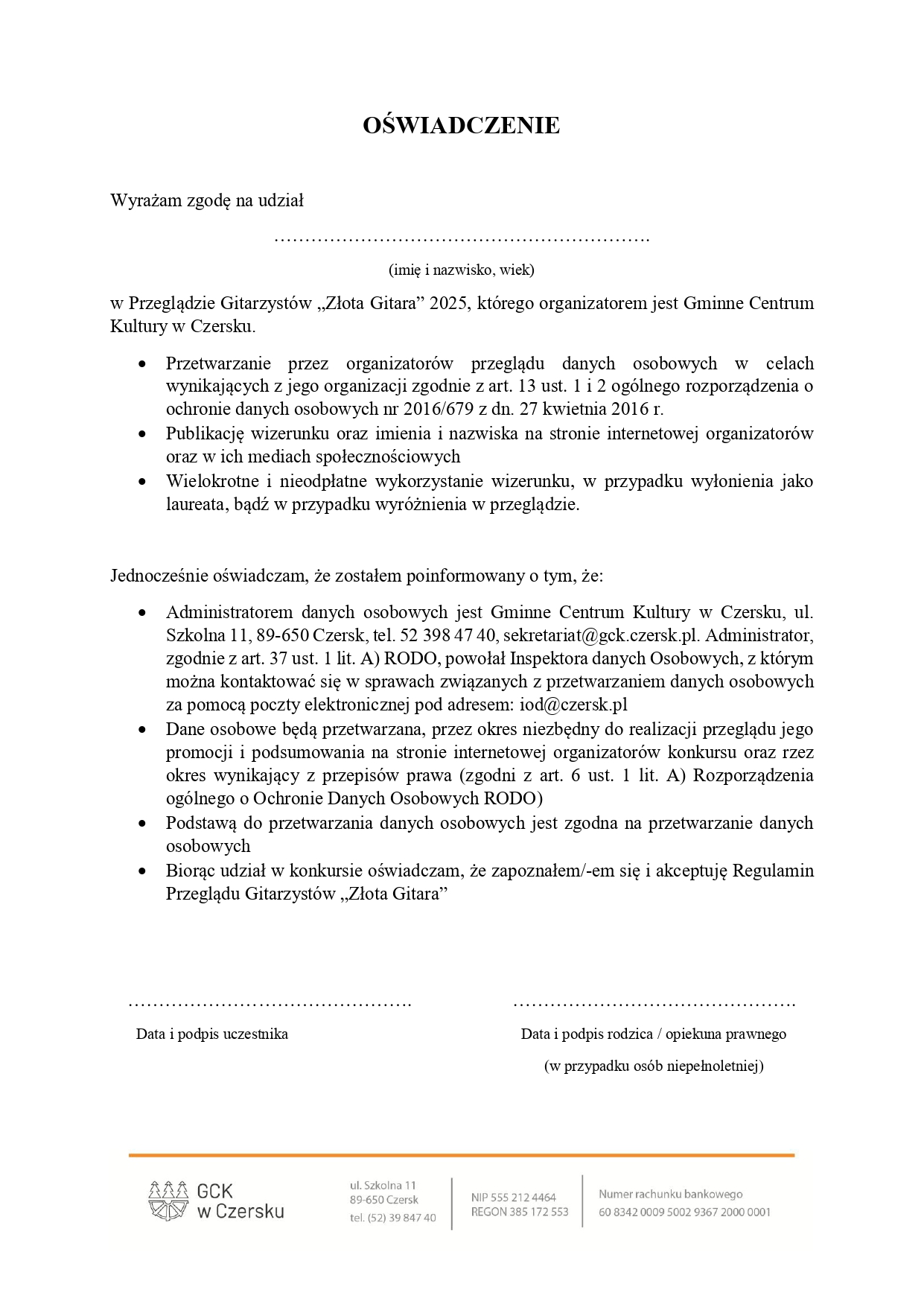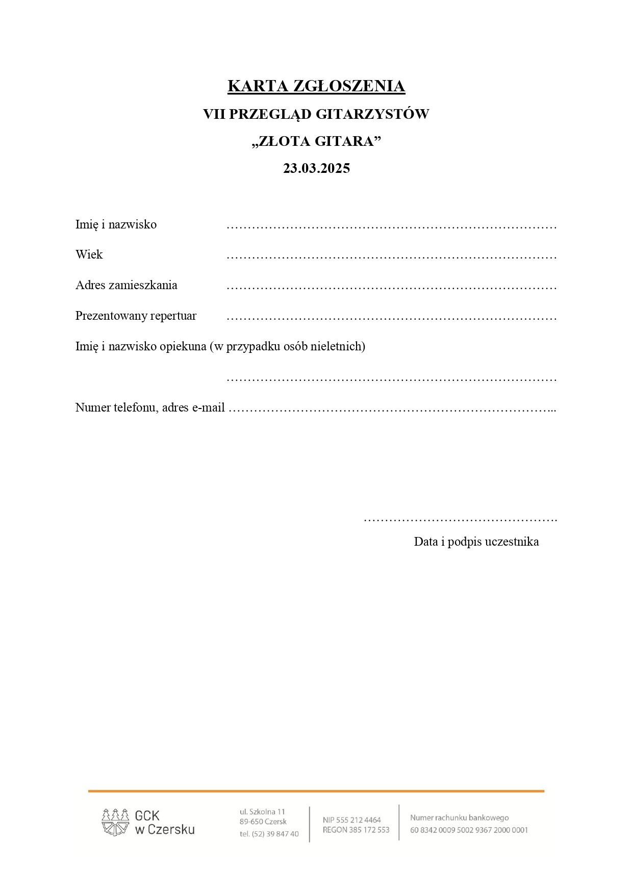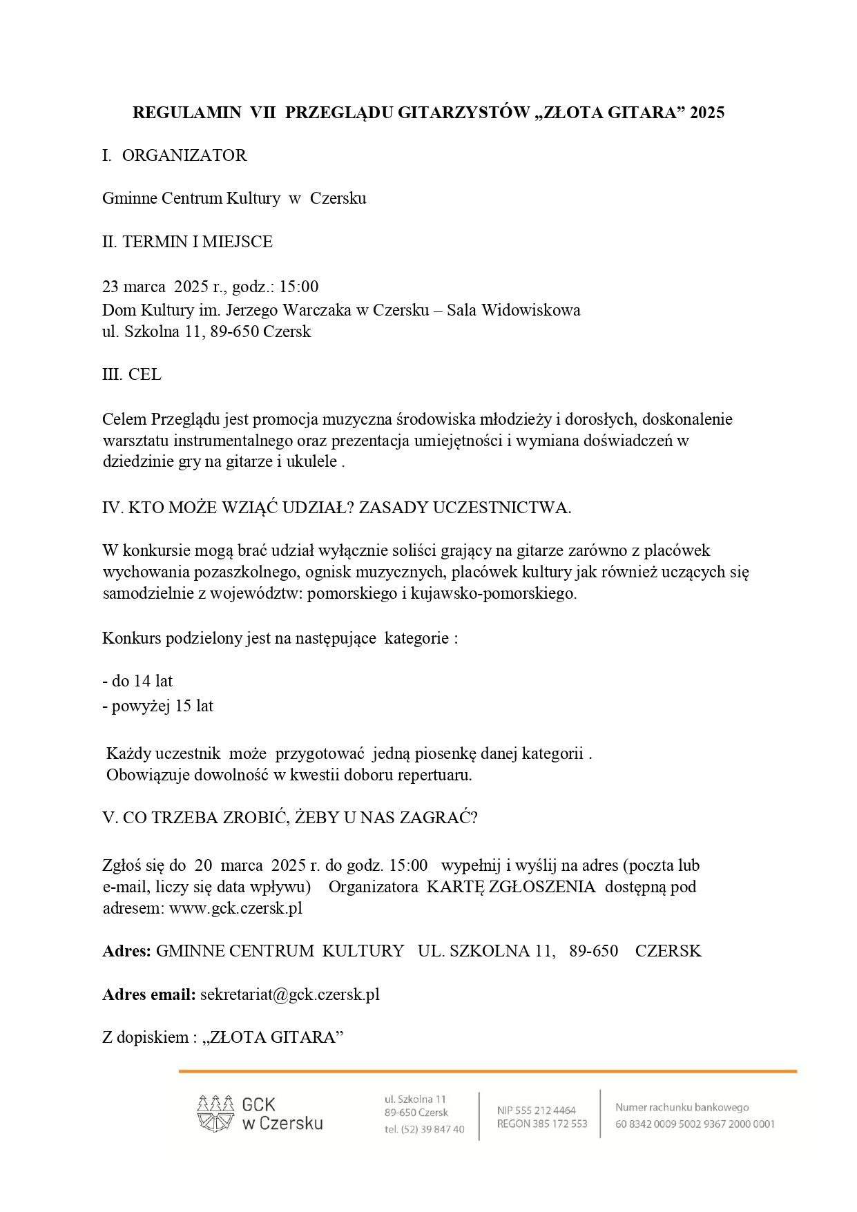 Aby wziąć udział w przeglądzie, należy do 20 marca do godziny 15:00 wysłać wypełnioną kartę zgłoszenia (dostępną w załączniku oraz na stronie Gminnego Centrum Kultury w Czersku https://gck.czersk.pl/aktualnosc/dom-kultury-w-czersku/4977-zlota-gitara) na podany adres e-mail.