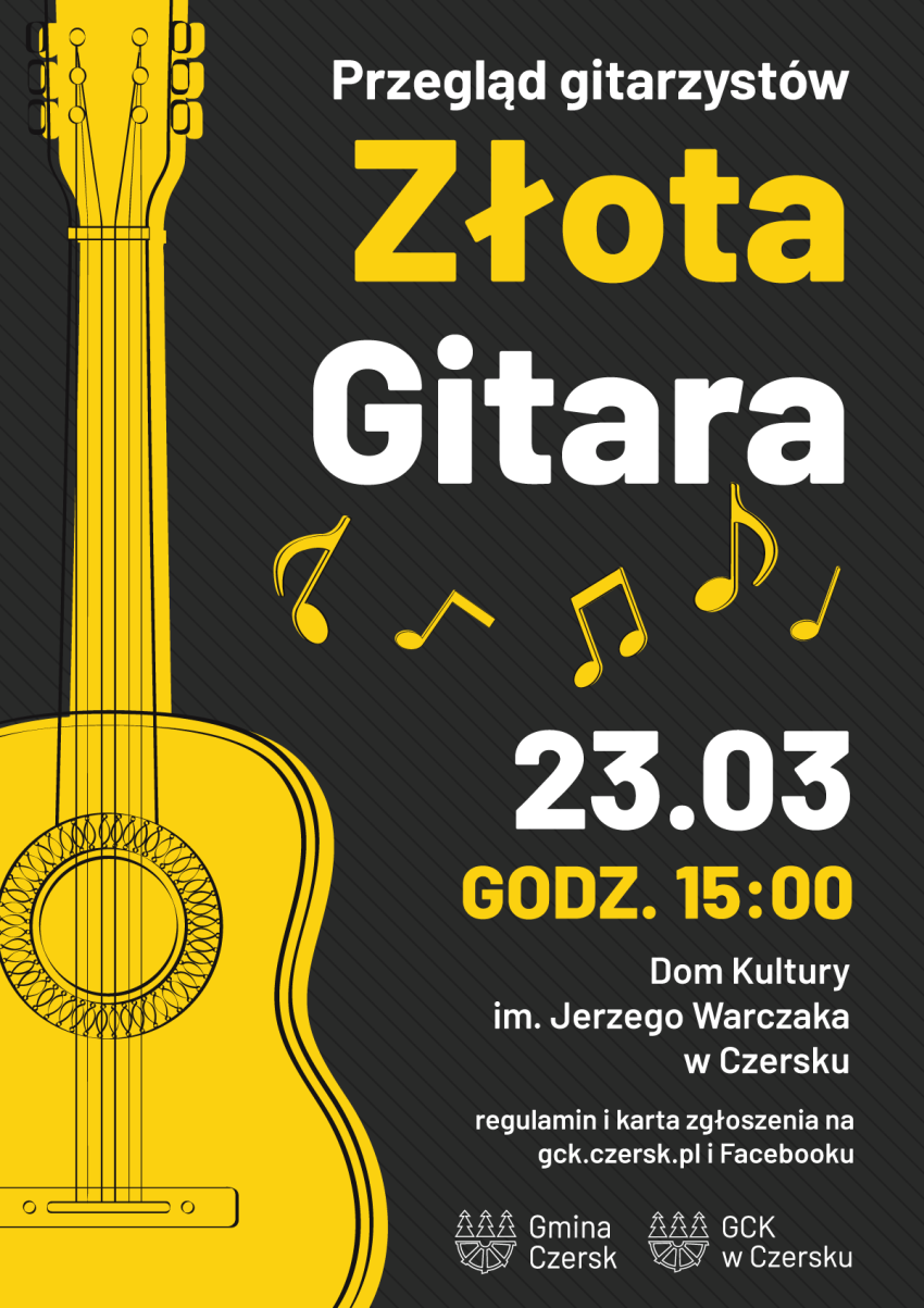 Miłośnicy gitarowych brzmień ponownie spotkają się w Czersku. W niedzielę 23 marca o godzinie 15:00 w Domu Kultury im. Jerzego Warczaka odbędzie się VII Przegląd Gitarzystów „Złota Gitara”. Organizatorami są gmina Czersk oraz Gminne Centrum Kultury w Czersku.