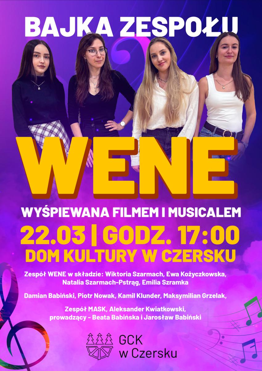 22 marca o godzinie 17:00 w Domu Kultury w Czersku odbędzie się koncert zespołu WENE. „Bajka zespołu WENE” to widowisko, w którym film i musical splatają się w muzyczną opowieść. Na scenie, obok zespołu, pojawią się zaproszeni goście, tworząc wyjątkową atmosferę pełną dźwięków i emocji. Na wydarzenie zaprasza Gminne Centrum Kultury w Czersku.