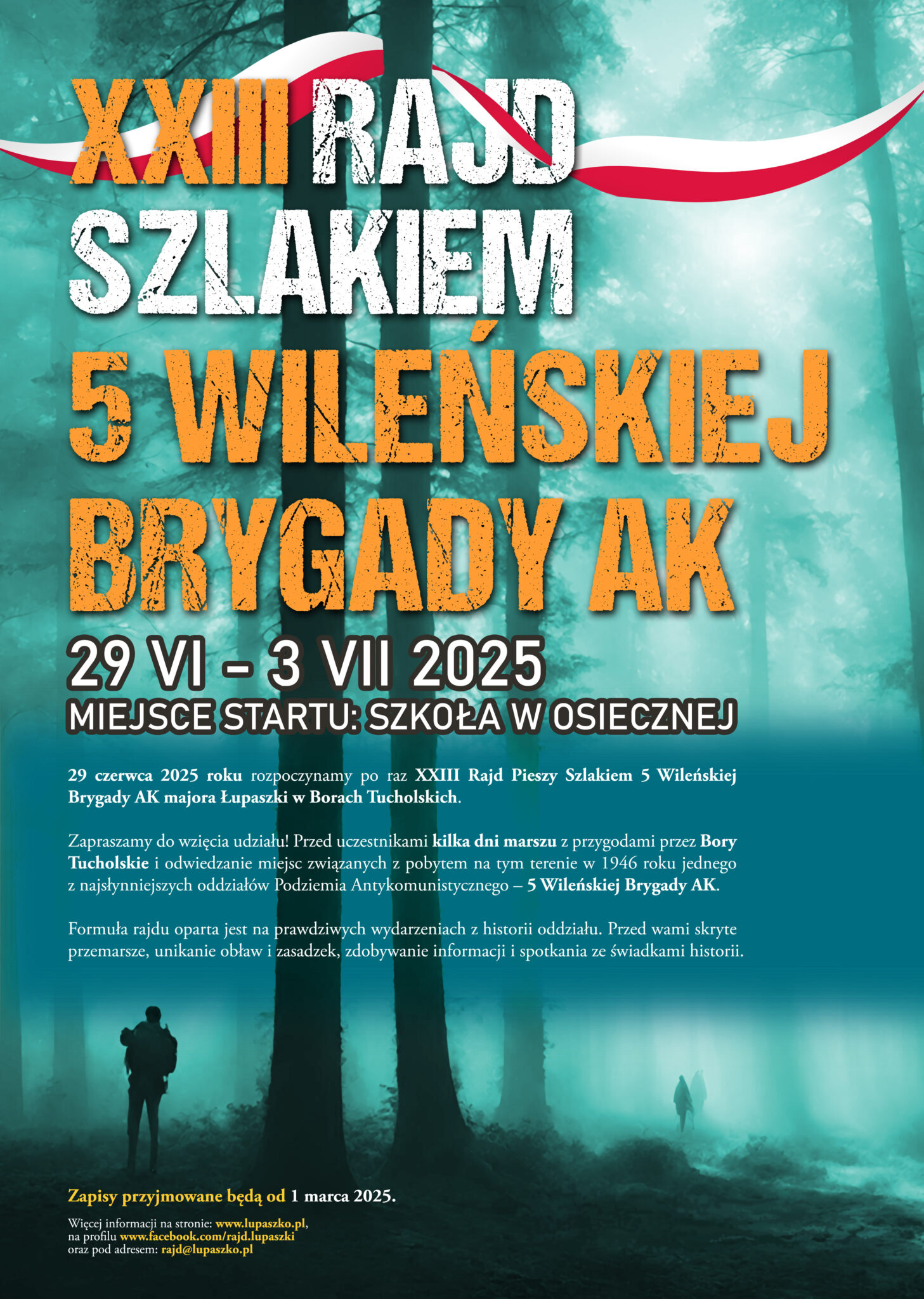 Stowarzyszenie Historyczne im. 5 Wileńskiej Brygady AK serdecznie zaprasza do udziału w XXIII Rajdzie Pieszym Szlakiem 5 Wileńskiej Brygady AK mjr. "Łupaszki". Wydarzenie odbędzie się w dniach 29 czerwca – 3 lipca 2025 roku i rozpocznie się w szkole w Osiecznej.