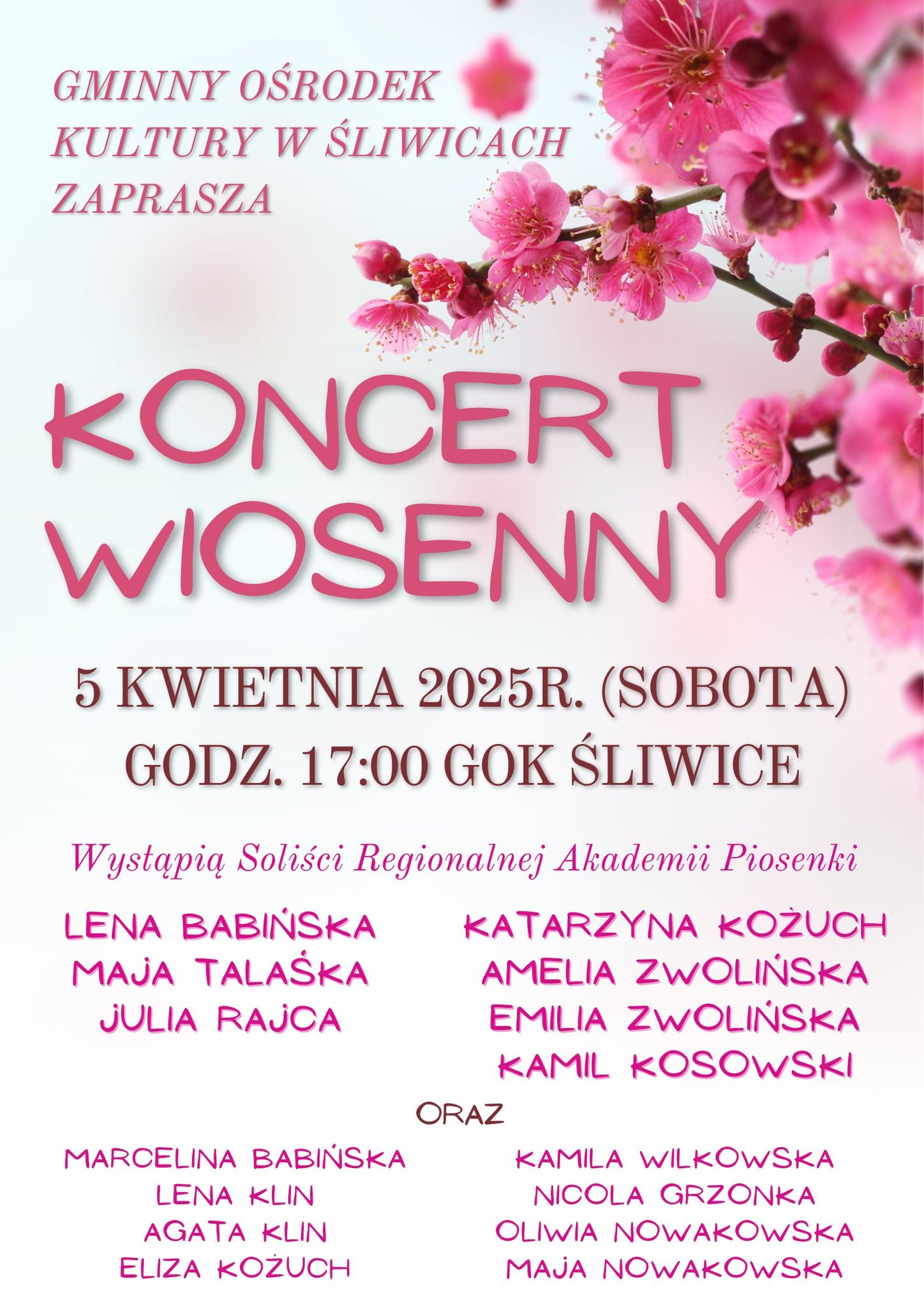 Gminny Ośrodek Kultury w Śliwicach zaprasza na Koncert Wiosenny, który odbędzie 5 kwietnia (sobota) o godzinie 17:00 w sali GOK.