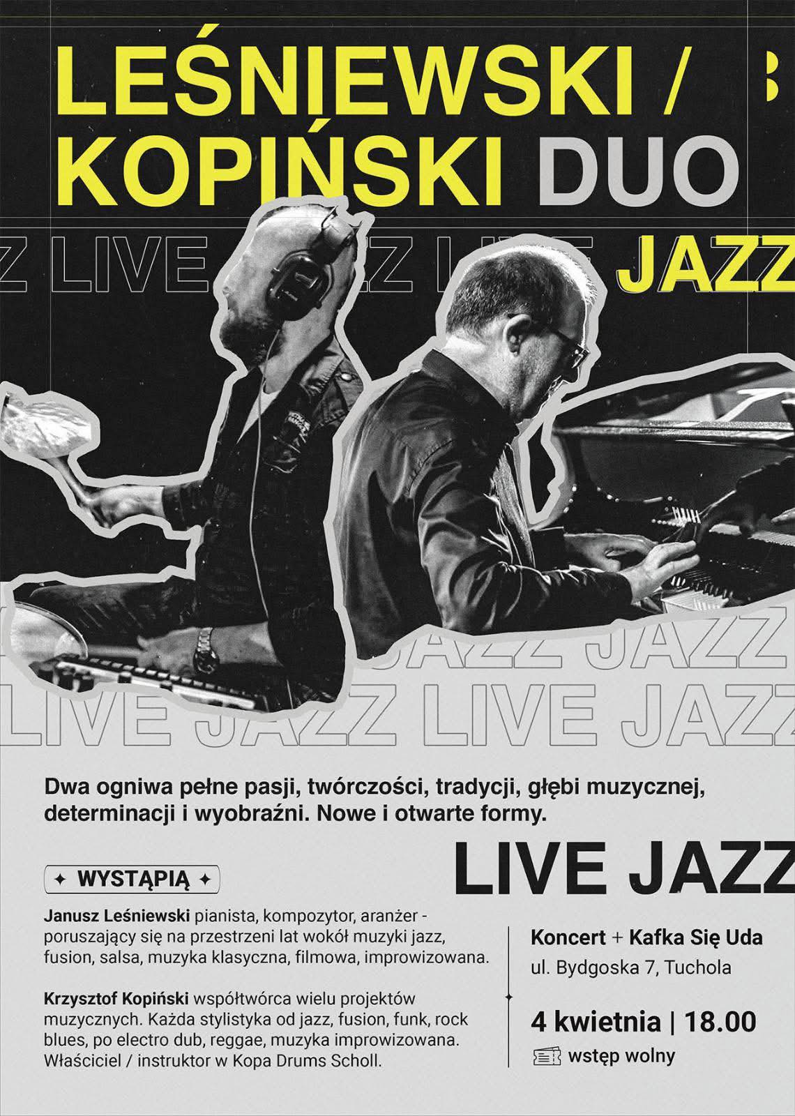 Wieczór zapoczątkuje koncert jazzowy w wykonaniu Leśniewski & Kopiński Duo, którzy swoją muzyką stworzą niepowtarzalny klimat pełen emocji i wrażliwości.