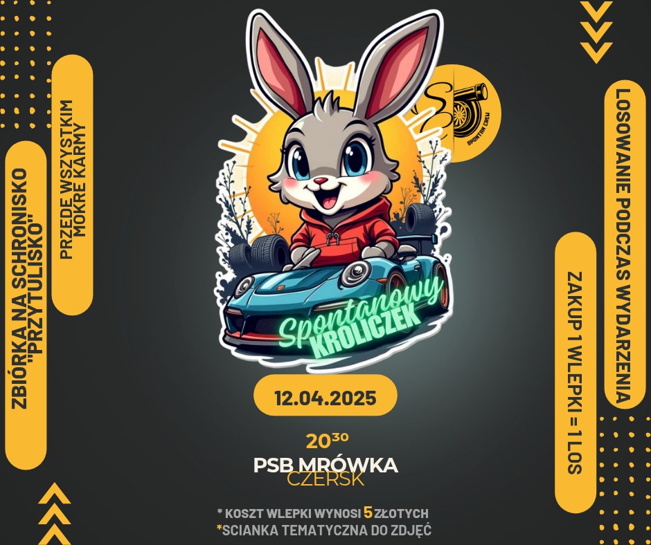 Spontan Crew zaprasza na kolejne motoryzacyjne spotkanie, tym razem pod nazwą "Spontanowy Króliczek". Wydarzenie to nie tylko okazja do spotkania pasjonatów motoryzacji, ale także możliwość wsparcia schroniska Przytulisko w Chojnicach. Miejsce spotu: parking przy PSB Mrówka w Czersku. Termin: 12 kwietnia 2025, godz. 20:30-22:30.