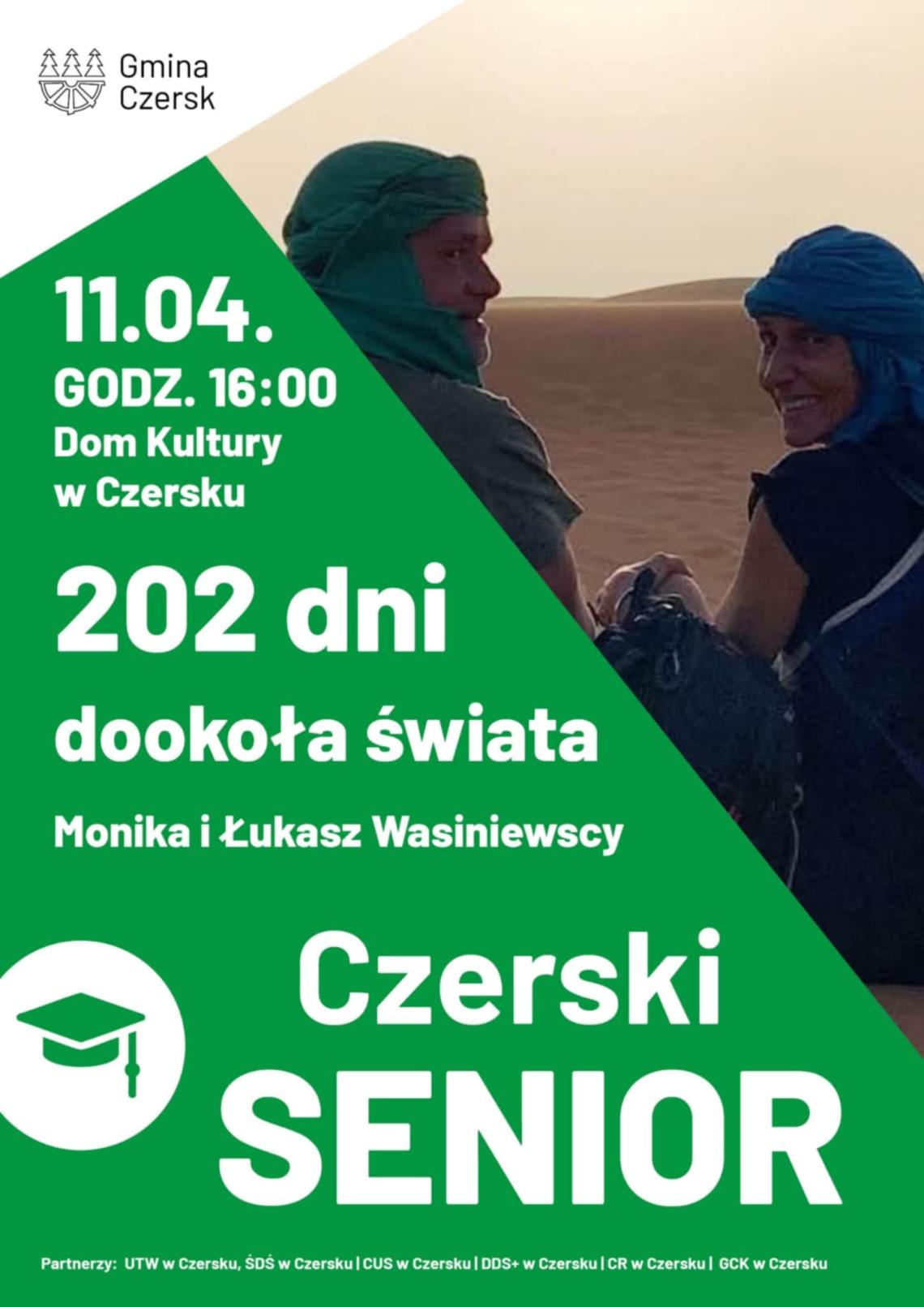 11 kwietnia w Domu Kultury w Czersku odbędzie się spotkanie z Moniką i Łukaszem Wasiniewskimi – nauczycielami ze Szkoły Podstawowej nr 2 w Czersku, którzy przez 202 dni podróżowali dookoła świata. Odwiedzili 12 krajów na 5 kontynentach i pokonali ponad 56 tysięcy kilometrów. Podczas wydarzenia opowiedzą o swojej podróży, dzieląc się doświadczeniami, wspomnieniami i refleksjami z wyprawy.