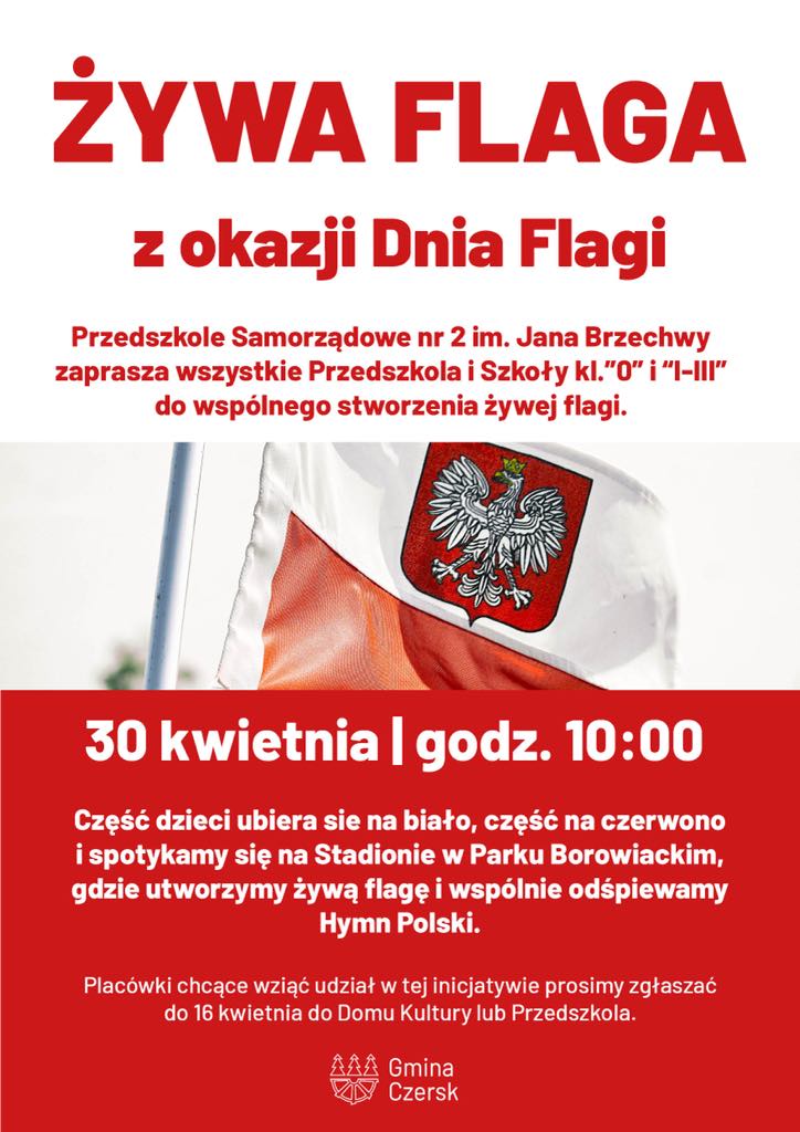 Przedszkole Samorządowe nr 2 im. Jana Brzechwy zaprasza wszystkie przedszkola oraz klasy „0” i I–III szkół podstawowych do udziału w wydarzeniu patriotycznym „Żywa flaga”, organizowanym z okazji Dnia Flagi Rzeczypospolitej Polskiej.