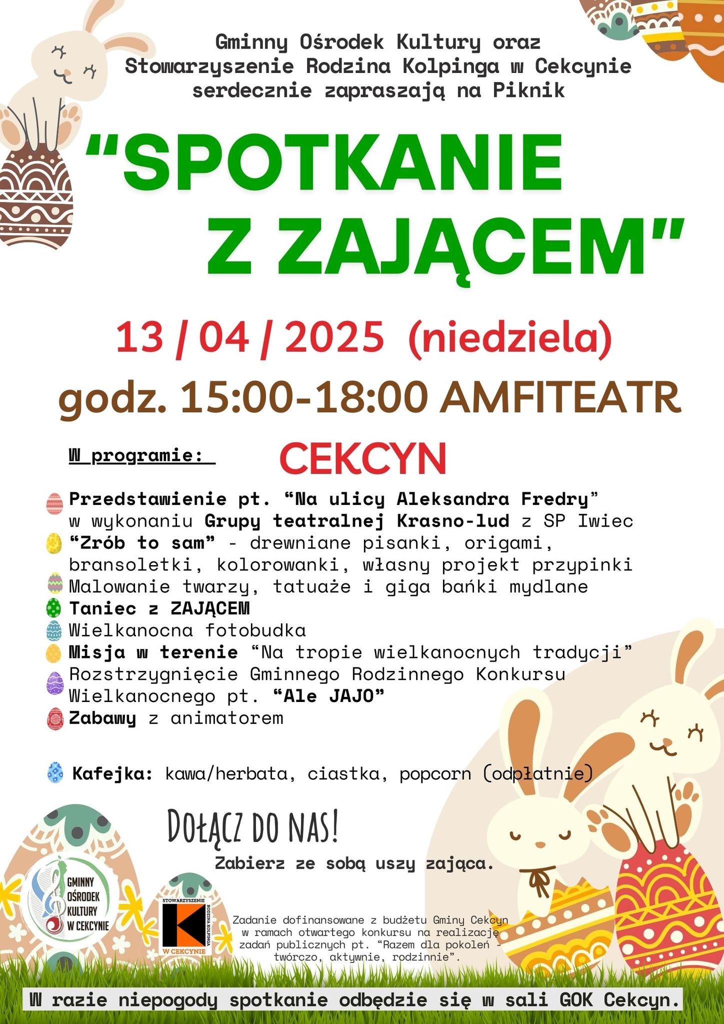 Gminny Ośrodek Kultury w Cekcynie oraz Stowarzyszenie Rodzina Kolpinga w Cekcynie zapraszają na rodzinny piknik „Spotkanie z zającem”, który odbędzie się w niedzielę, 13 kwietnia, w godz. 15:00–18:00 na cekcyńskim amfiteatrze. W programie m.in. przedstawienie „Na ulicy Aleksandra Fredry” w wykonaniu grupy teatralnej Krasno–lud z SP w Iwcu, kreatywne warsztaty „Zrób to sam” (pisanki, origami, bransoletki, przypinki), malowanie twarzy, tatuaże, giga bańki mydlane, taniec z zającem, wielkanocna fotobudka oraz terenowa gra „Na tropie wielkanocnych tradycji”. Podczas wydarzenia nastąpi również rozstrzygnięcie Gminnego Rodzinnego Konkursu Wielkanocnego „Ale JAJO”. Na miejscu dostępna będzie kafejka z kawą, herbatą, ciastkami i popcornem (odpłatnie). Organizatorzy zachęcają do zabrania zajęczych uszu i informują, że w razie niepogody wydarzenie odbędzie się w sali GOK w Cekcynie.