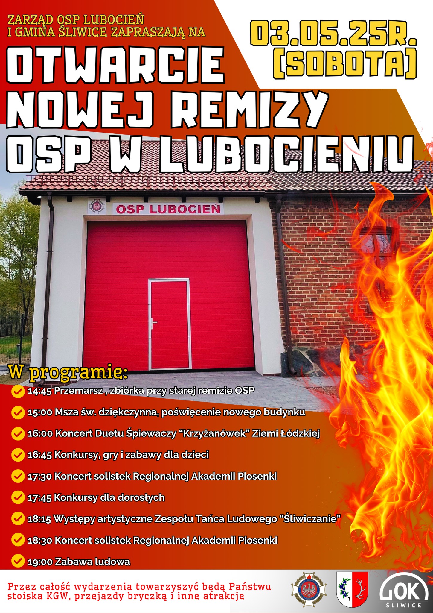 Zarząd OSP w Lubocieniu, gmina Śliwice oraz GOK w Śliwicach zapraszają na uroczyste otwarcie nowej remizy OSP w Lubocieniu, które odbędzie się w sobotę 3 maja, począwszy od godziny 14:45. Wydarzenie rozpocznie się symbolicznym pochodem do nowego budynku remizy, a o godzinie 15:00 odbędzie się msza święta dziękczynna. Po jej zakończeniu nastąpi poświęcenie i uroczyste otwarcie remizy.