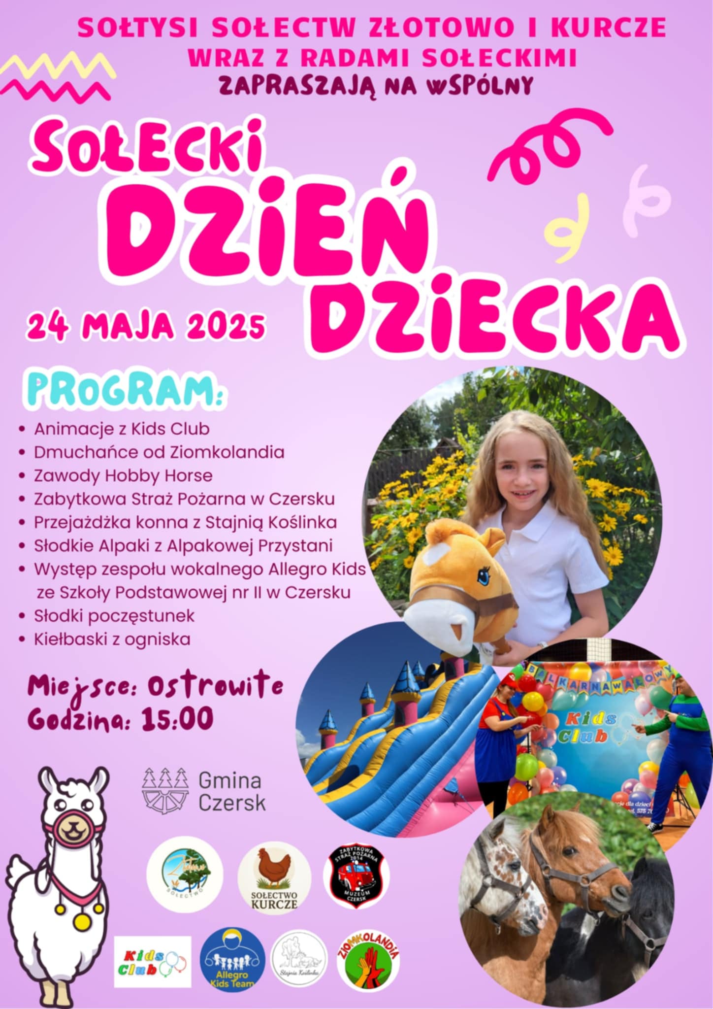W programie wiele atrakcji dla najmłodszych: animacje z Kids Club, dmuchańce od Ziomkolandii, zawody Hobby Horse, Zabytkowa Straż Pożarna z Czerska, przejażdżki konne ze Stajnią Koślinka, słodkie alpaki z Alpakowej Przystani, występ zespołu wokalnego Allegro Kids ze Szkoły Podstawowej nr 2 w Czersku, słodki poczęstunek oraz kiełbaski z ogniska.