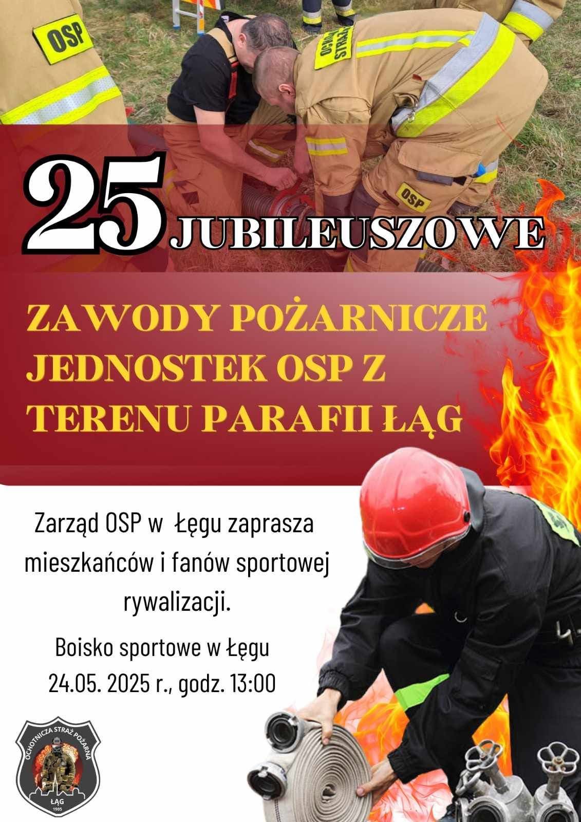 Zarząd Ochotniczej Straży Pożarnej w Łęgu zaprasza mieszkańców oraz fanów sportowej rywalizacji na 25. jubileuszowe zawody pożarnicze jednostek OSP z terenu parafii Łąg. Wydarzenie odbędzie się 24 maja o godzinie 13:00 na boisku sportowym w Łęgu. Zawody będą okazją do obserwowania zmagań drużyn strażackich i zaprezentowania ich sprawności w konkurencjach sportowo-pożarniczych.