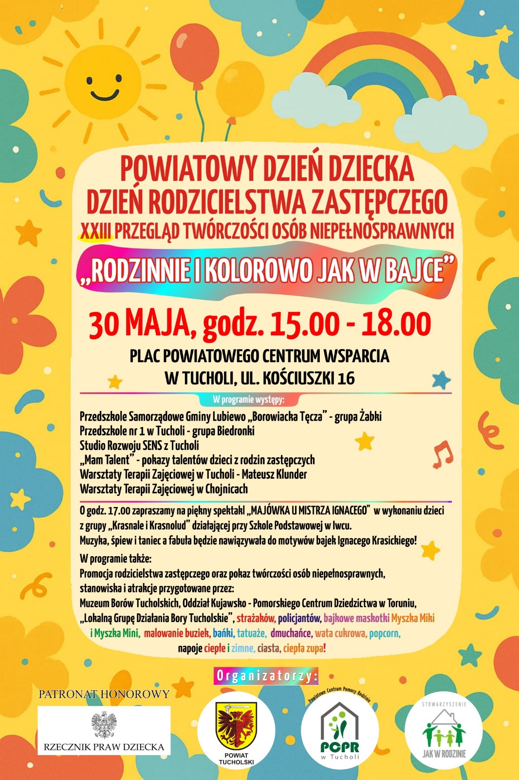 Już w najbliższy piątek 30 maja odbędzie się Powiatowy Dzień Dziecka, Dzień Rodzicielstwa Zastępczego i XXIII Przegląd Twórczości Osób Niepełnosprawnych. Impreza zaczyna się o godzinie 15:00 na placu Powiatowego Centrum Wsparcia przy ulicy Kościuszki 16.