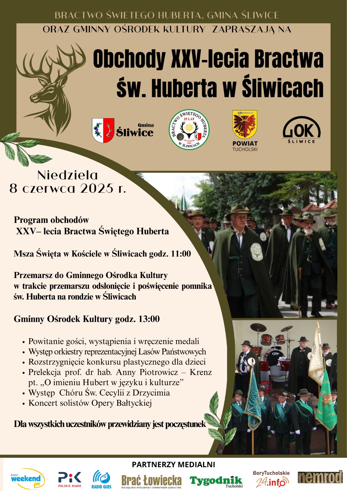 Bractwo Świętego Huberta, gmina Śliwice oraz Gminny Ośrodek Kultury w Śliwicach zapraszają na uroczyste obchody 25-lecia Bractwa Świętego Huberta, które odbędą się 8 czerwca w Śliwicach.