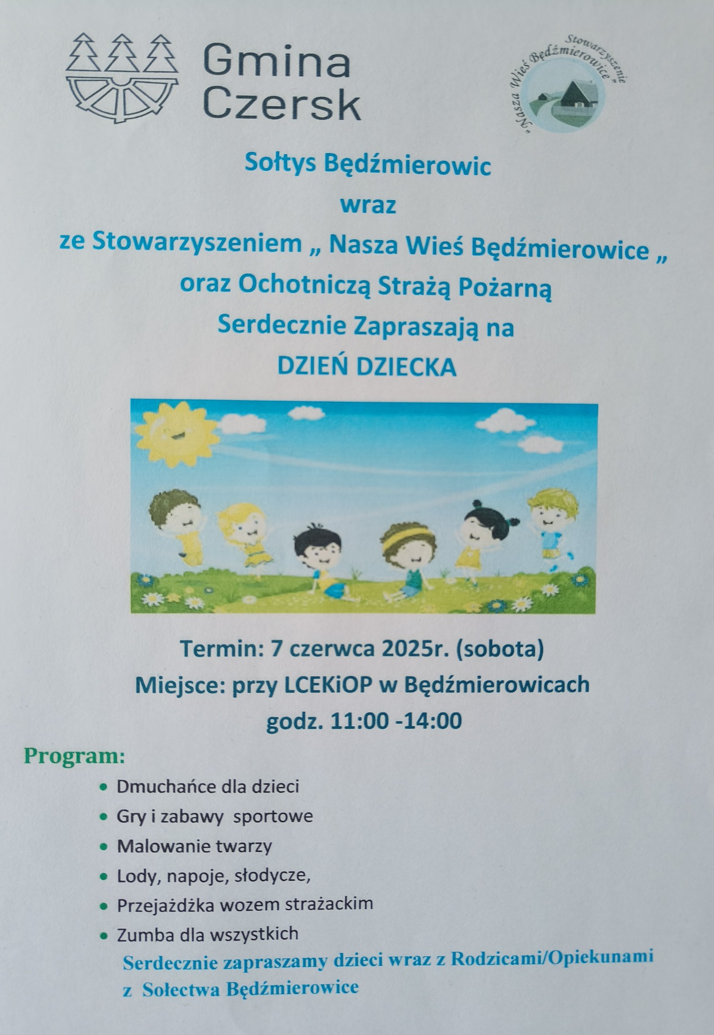 Sołectwo Będźmierowice oraz Ochotnicza Straż Pożarna w Będźmierowicach zapraszają dzieci wraz z rodzinami i opiekunami z sołectwa na obchody Dnia Dziecka, które odbędą się 7 czerwca w godzinach 11:00–14:00 przy Lokalnym Centrum Kultury, Edukacji i Organizacji Pozarządowych w Będźmierowicach.