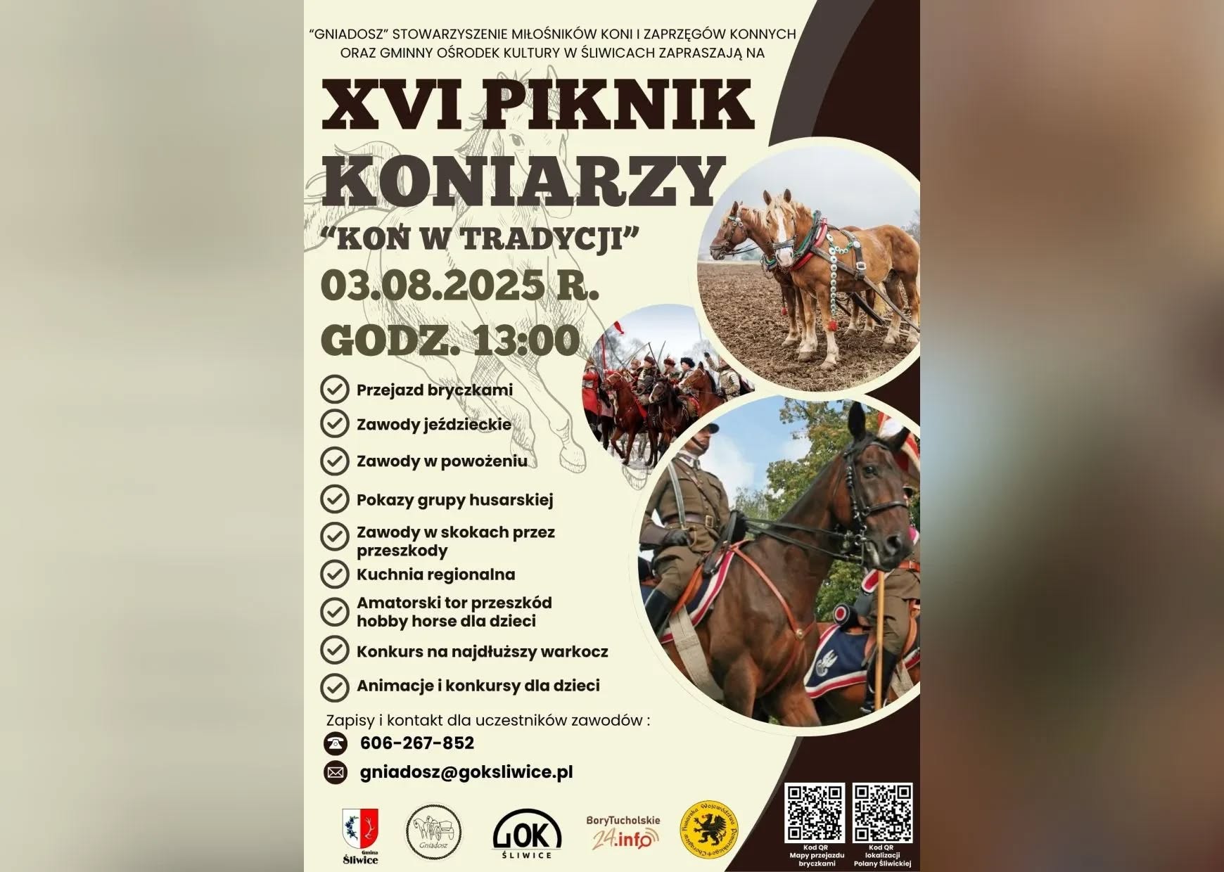 Stowarzyszenie Miłośników Koni i Zaprzęgów Konnych „Gniadosz” oraz Gminny Ośrodek Kultury w Śliwicach zapraszają na XVI edycję Pikniku Koniarzy pt. „Koń w tradycji”, która odbędzie się w niedzielę, 3 sierpnia 2025 r. na Polanie Śliwickiej (przy ul. Podgórnej w Śliwicach).