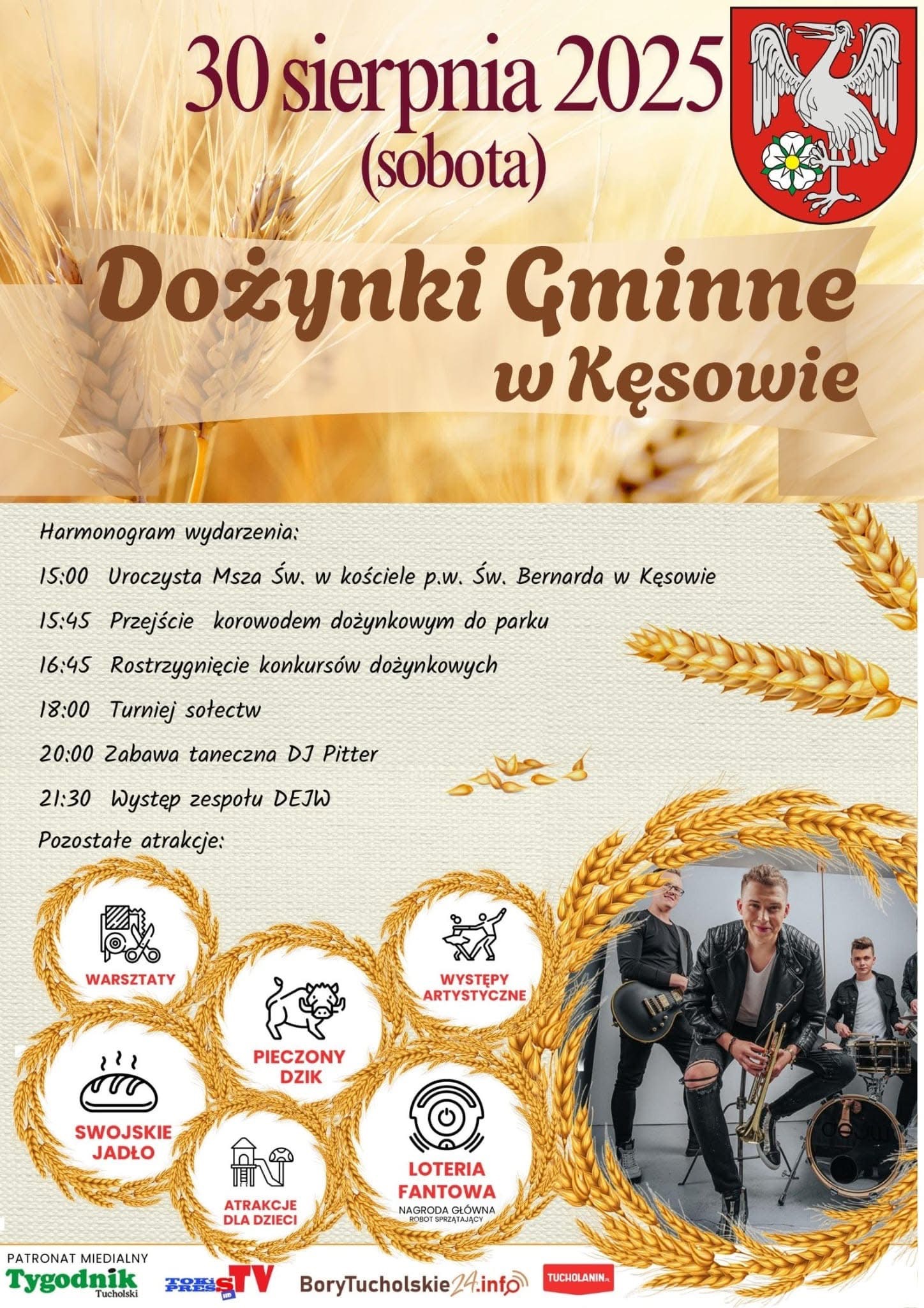 Dożynki gminne w Kęsowie odbędą się 30 sierpnia. Uroczystości rozpoczną się mszą świętą w kościele pw. św. Bernarda, po której przejdzie korowód dożynkowy z ciągnikami, maszynami i wieńcami. Część oficjalna w amfiteatrze rozpocznie się o 15:45 i obejmie występy mieszkańców, turniej sołectw, rozstrzygnięcie konkursów, występ zespołu Kęsowianki oraz koncert gwiazdy wieczoru – zespołu DEJW. Wieczorem odbędzie się zabawa taneczna z DJ Pitterem.