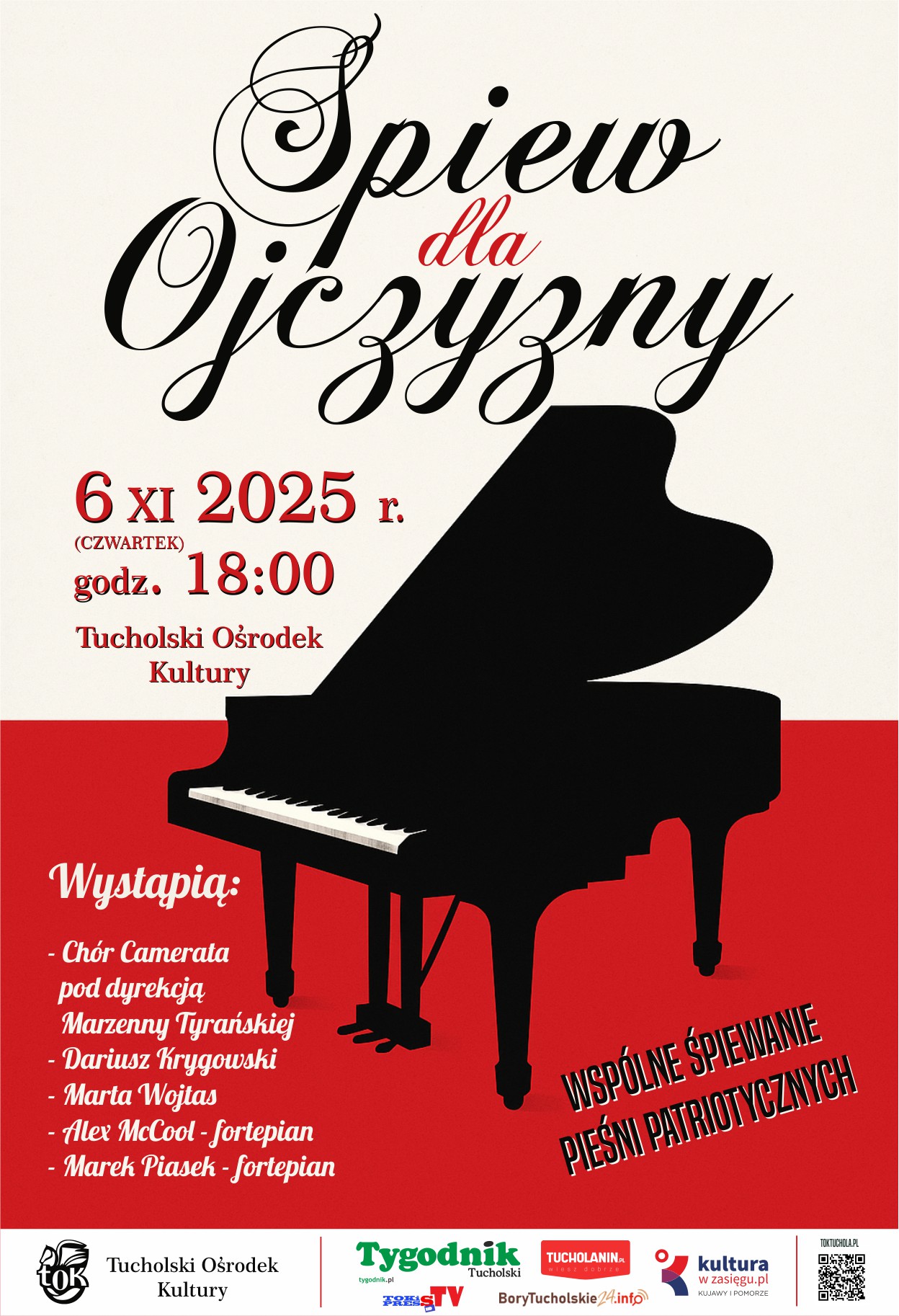 Serdecznie zapraszamy Państwa na wydarzenie „Śpiew dla Ojczyzny", które odbędzie się w czwartek 6 listopada 2025 r. o godz. 18:00 w Tucholskim Ośrodku Kultury. Podczas koncertu wystąpią: Chór Camerata pod dyrekcją Marzenny Tyrańskiej, Dariusz Krygowski, Marta Wojtas, Alex McCool (fortepian) i Marek Piasek (fortepian). Tradycyjnie odbędzie się również wspólne śpiewanie pieśni patriotycznych.