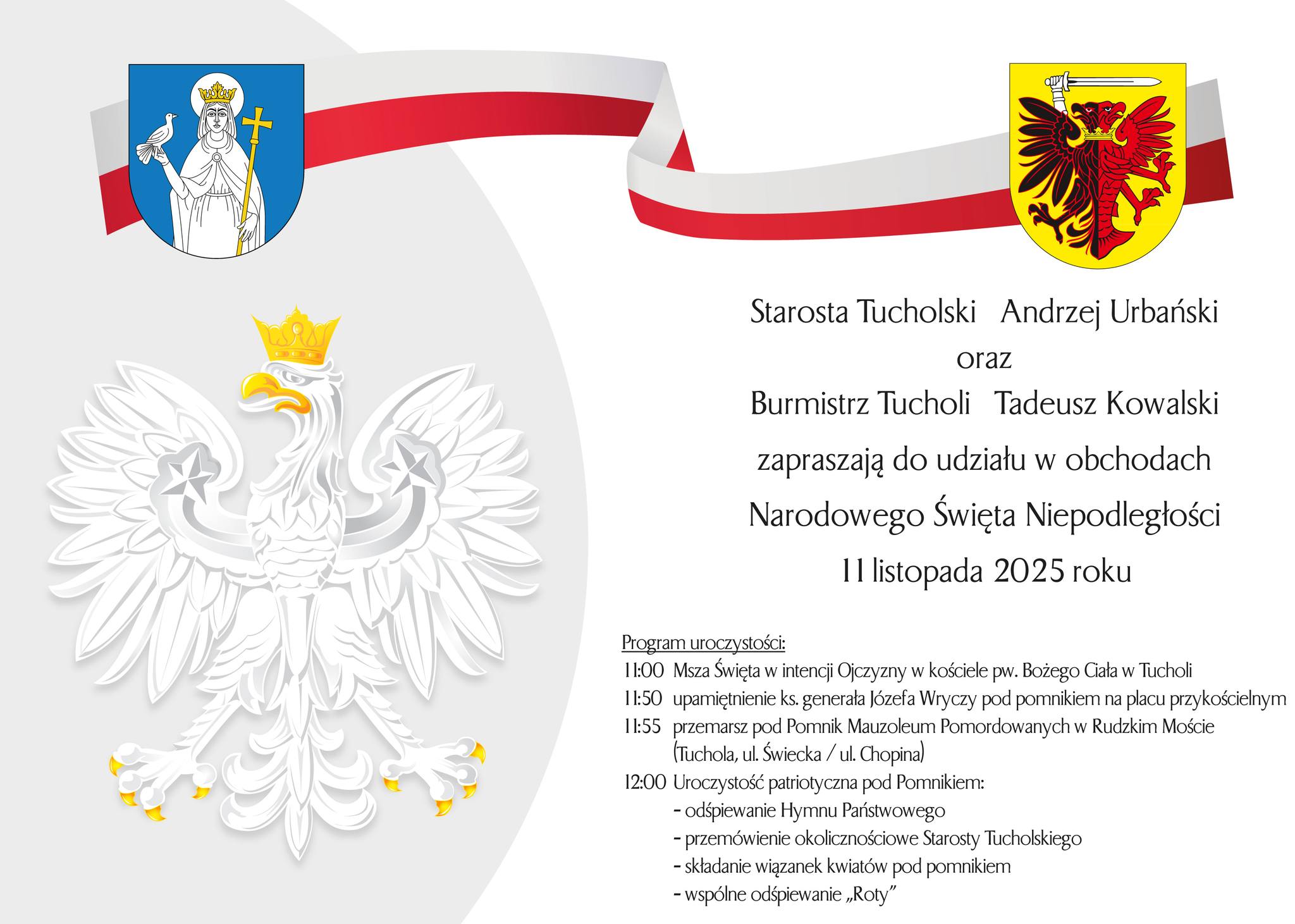 Starosta tucholski Andrzej Urbański oraz burmistrz Tucholi Tadeusz Kowalski serdecznie zapraszają do udziału w obchodach Narodowego Święta Niepodległości.