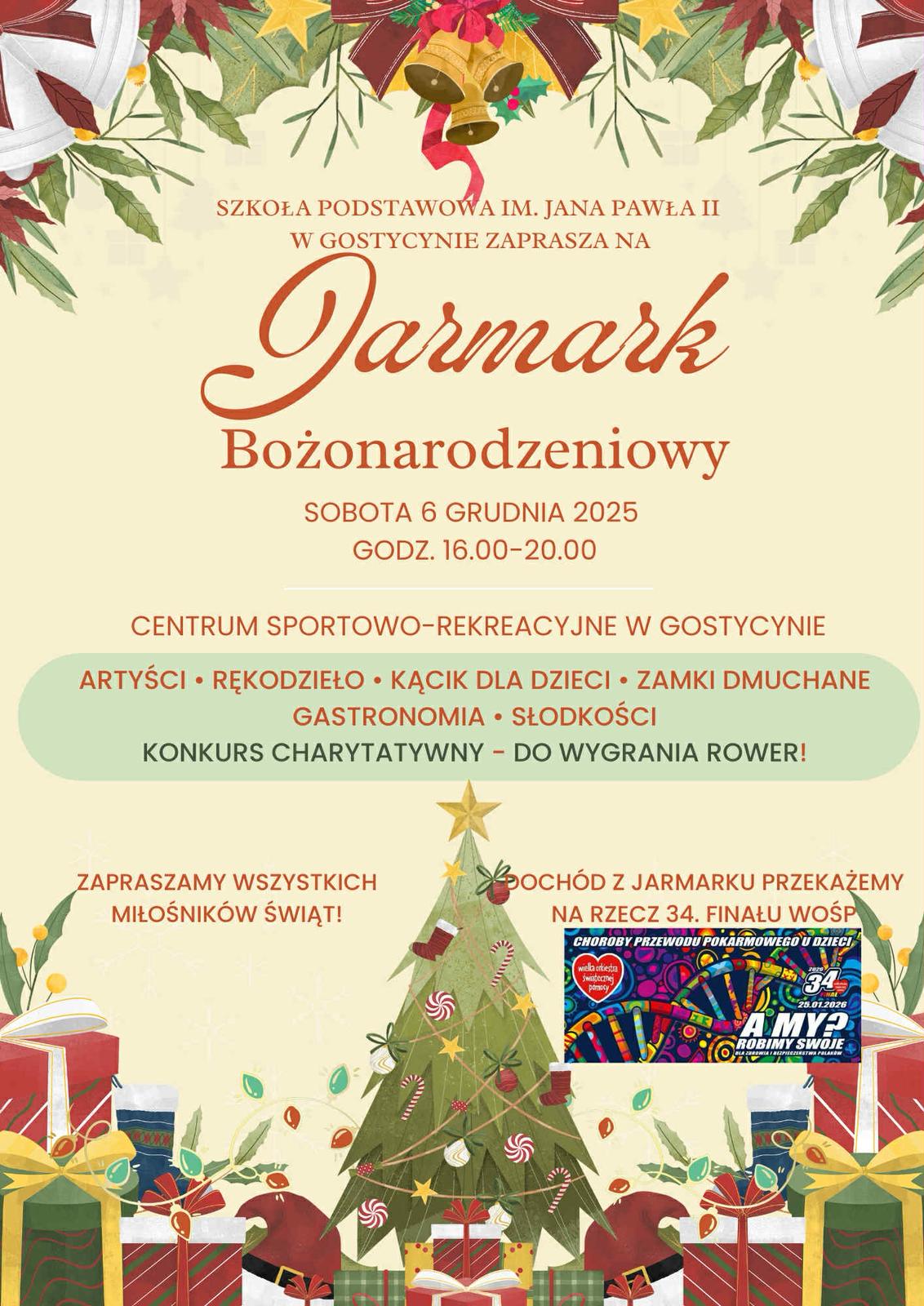 Szkoła Podstawowa im. Jana Pawła II w Gostycynie zaprasza na wyjątkowy Jarmark Bożonarodzeniowy, organizowany we współpracy ze Sztabem WOŚP w Gostycynie. To nie jest zwykły jarmark – dochód z wydarzenia zostanie przekazany na cel 34. Finału Wielkiej Orkiestry Świątecznej Pomocy.