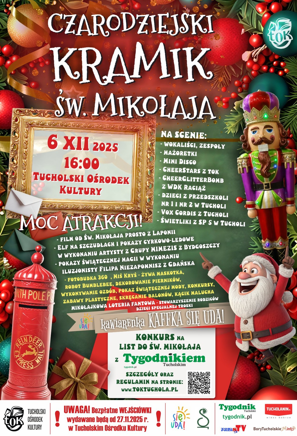 Zapraszamy na niezapomniane spotkanie do Tucholskiego Ośrodka Kultury już 6 grudnia 2025 r. o godz. 16:00.W związku z tym, że co roku impreza cieszy się ogromnym zainteresowaniem, informujemy, że bezpłatne wejściówki na nasze wydarzenie będzie można odbierać w sekretariacie TOK od 27 listopada br.