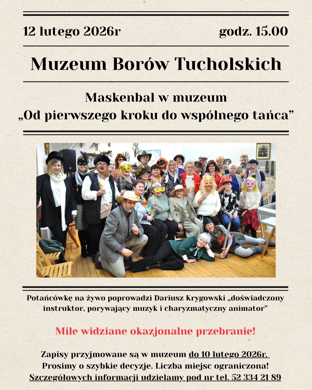Muzeum Borów Tucholskich zaprasza na ciekawe wydarzenie karnawałowe. Już w czwartek, 12 lutego o godzinie 15:00, odbędzie się maskenbal pod hasłem „Od pierwszego kroku do wspólnego tańca”. Spotkanie będzie idealną okazją do wspólnego świętowania ostatków, czyli ostatnich dni karnawału.