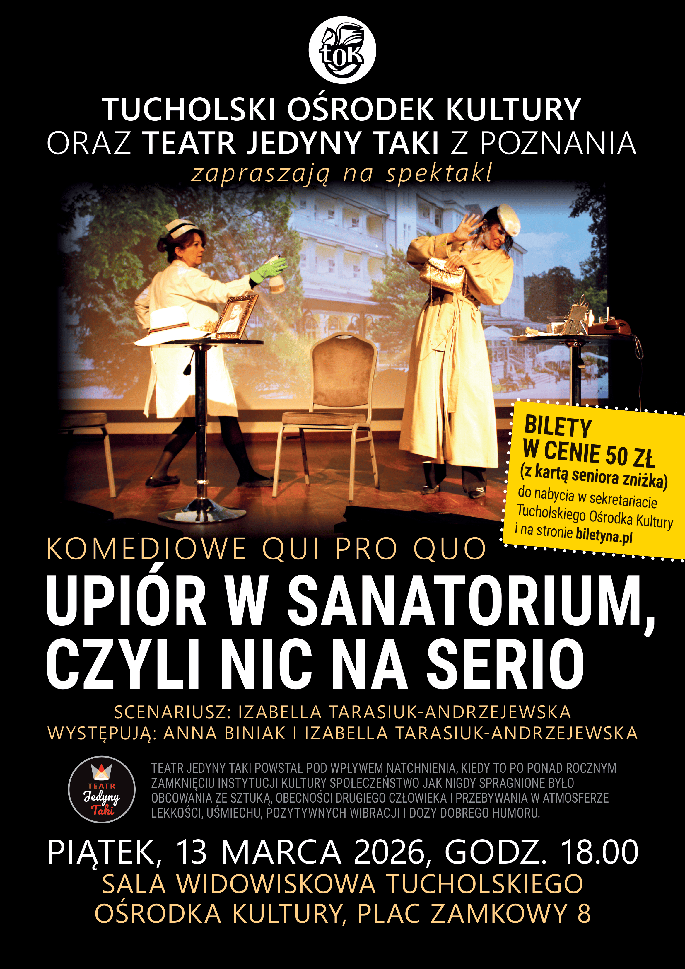 Już 13 marca 2026 roku w piątek o godzinie 18:00 w sali widowiskowej Tucholskiego Ośrodka Kultury odbędzie się spektakl „Upiór w sanatorium - czyli nic na serio” w wykonaniu Teatr Jedyny Taki.
